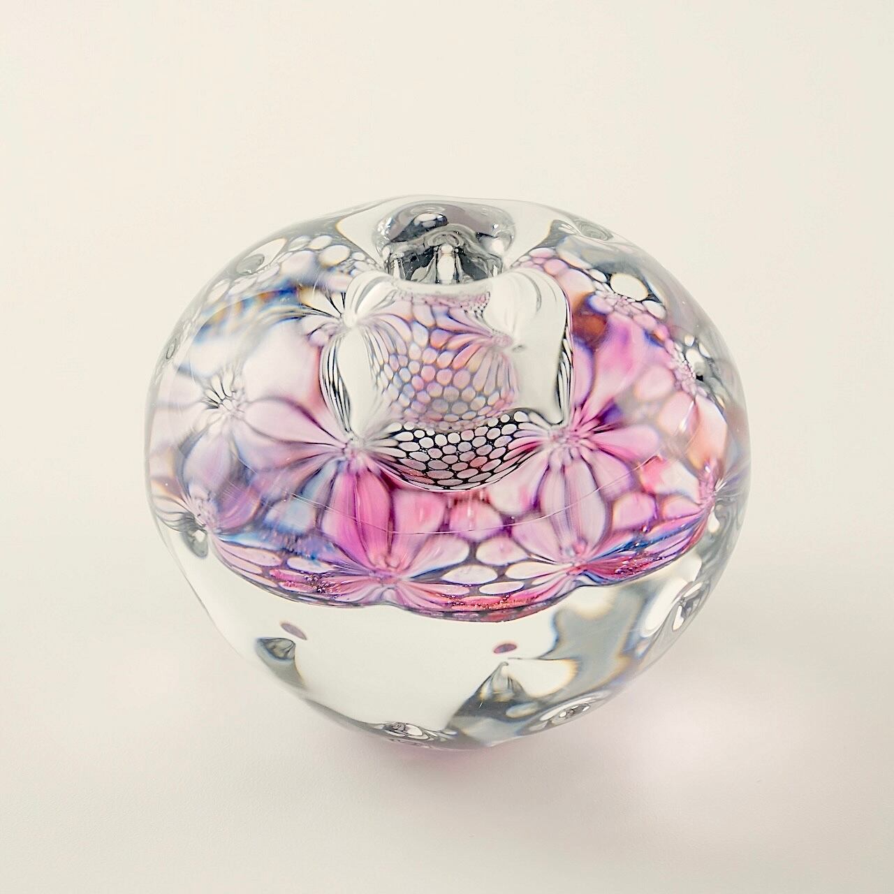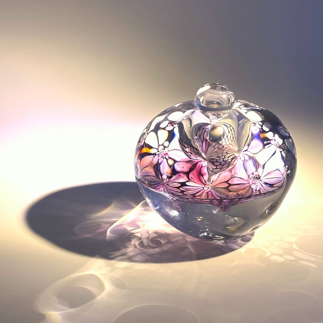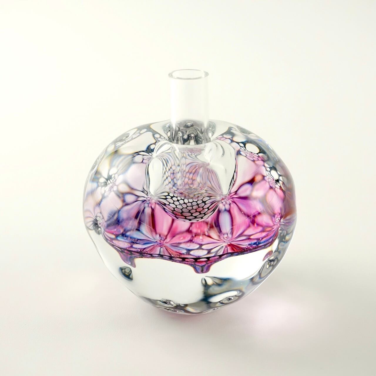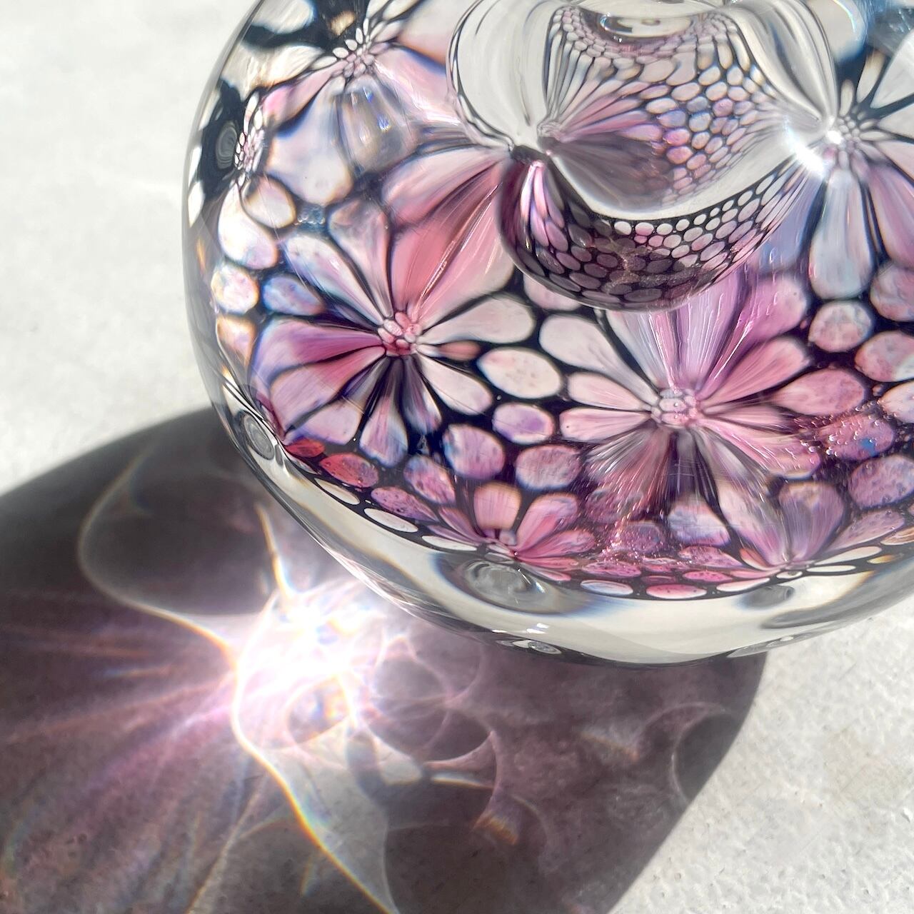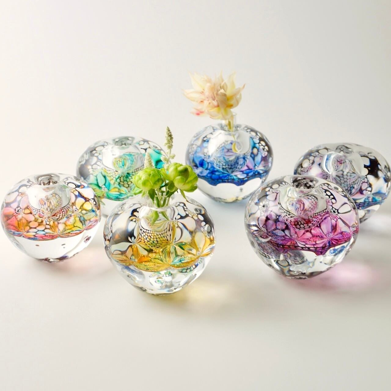 本体の中間に挟み込まれた何色もの色ガラスとエナメルで描いた模様の層が、ガラスの厚みと表面の凹みを通して万華鏡のように揺らめきます。色の組み合わせは一点一点異なり、光の当たり方によっても様々な表情をお楽しみいただけます。