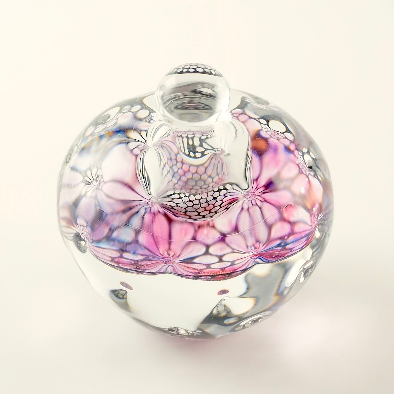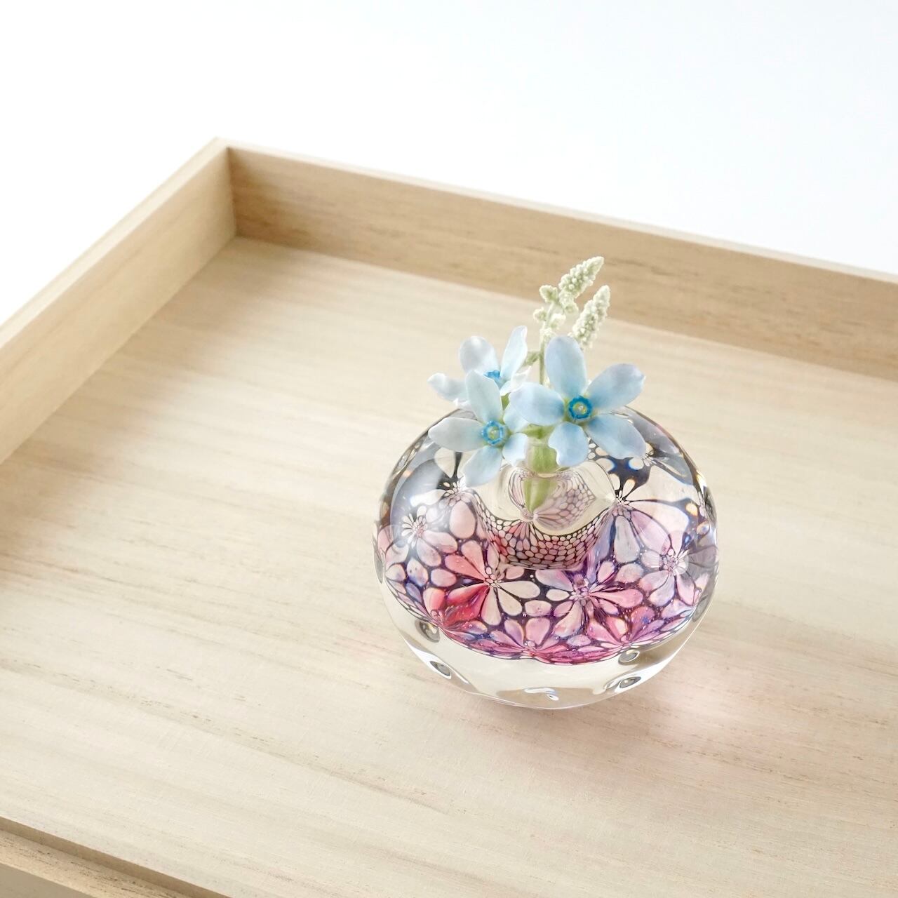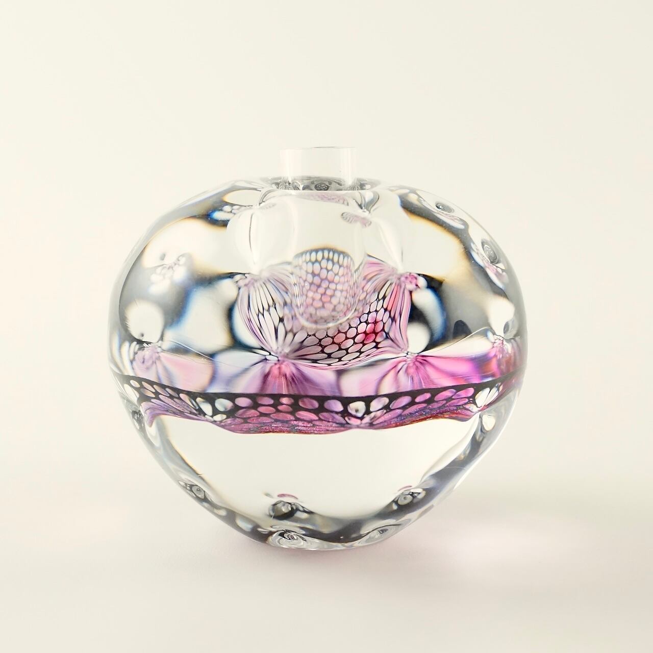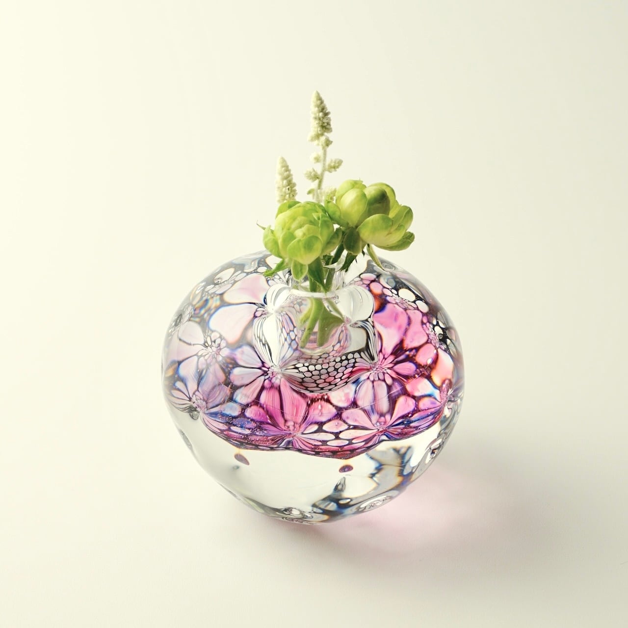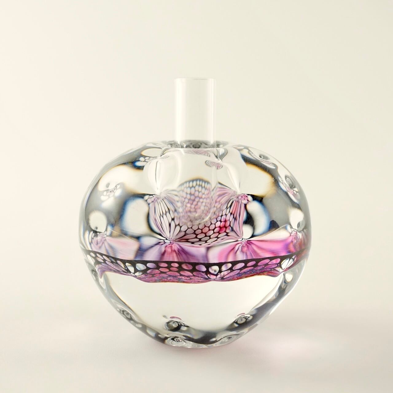 本体の中間に挟み込まれた何色もの色ガラスとエナメルで描いた模様の層が、ガラスの厚みと表面の凹みを通して万華鏡のように揺らめきます。色の組み合わせは一点一点異なり、光の当たり方によっても様々な表情をお楽しみいただけます。