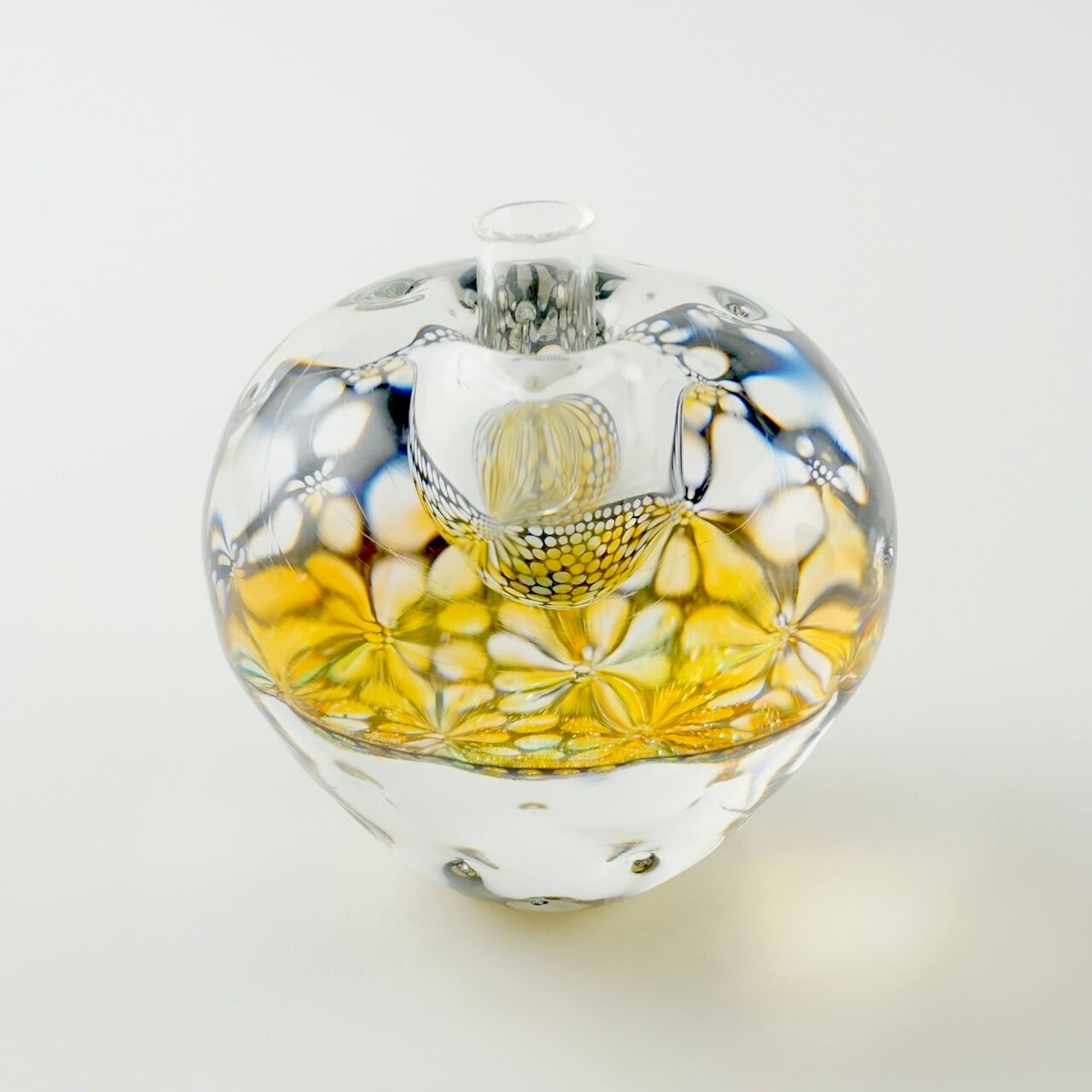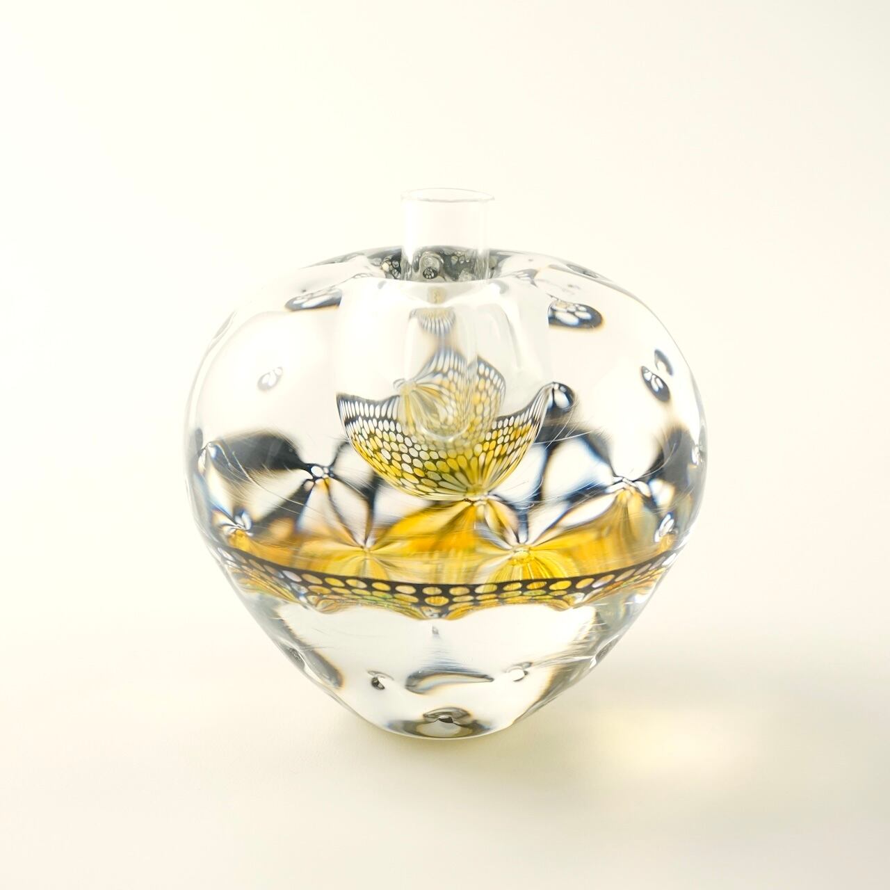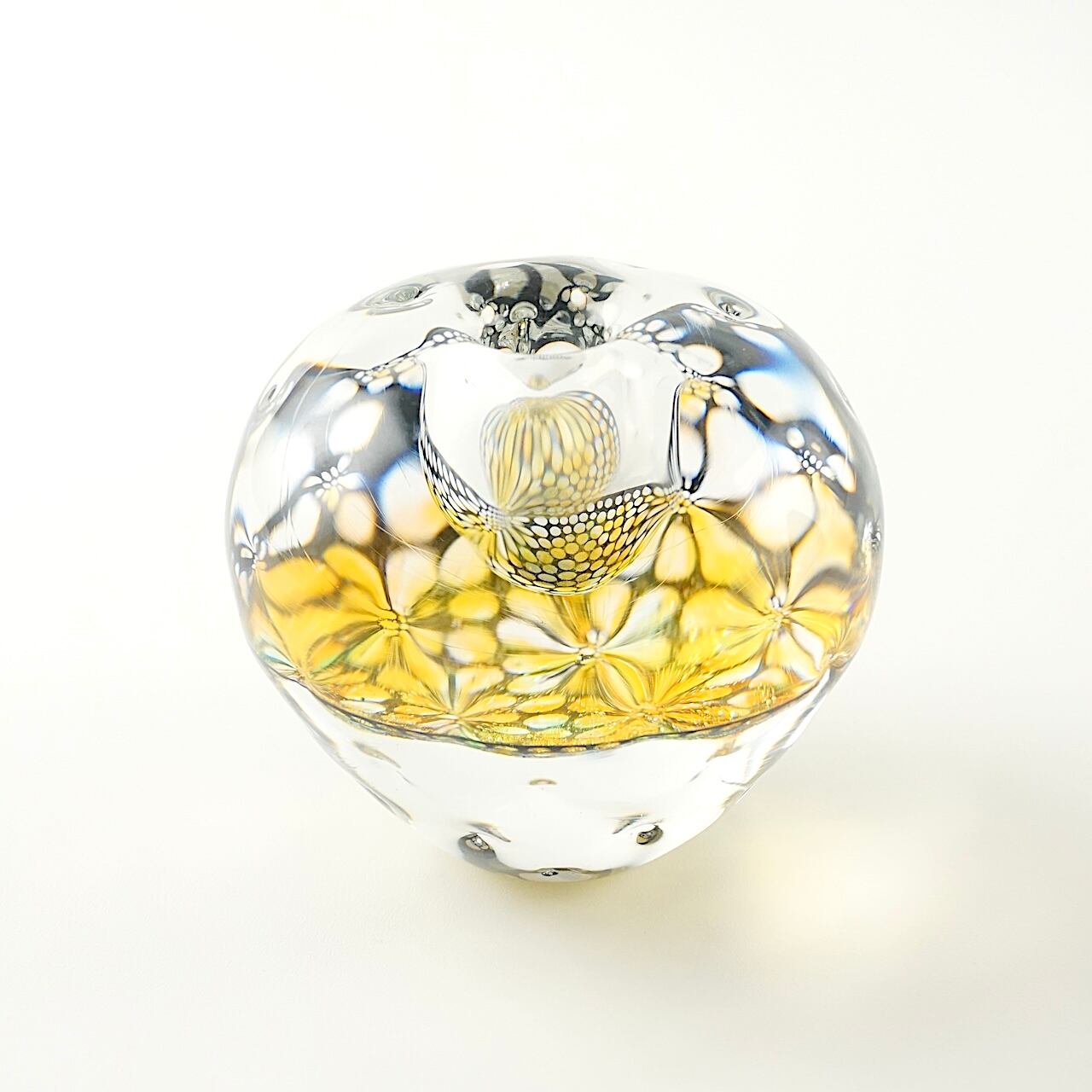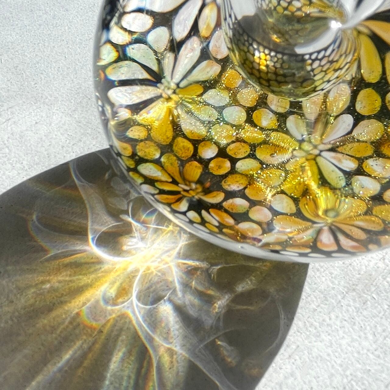 本体の中間に挟み込まれた何色もの色ガラスとエナメルで描いた模様の層が、ガラスの厚みと表面の凹みを通して万華鏡のように揺らめきます。色の組み合わせは一点一点異なり、光の当たり方によっても様々な表情をお楽しみいただけます。