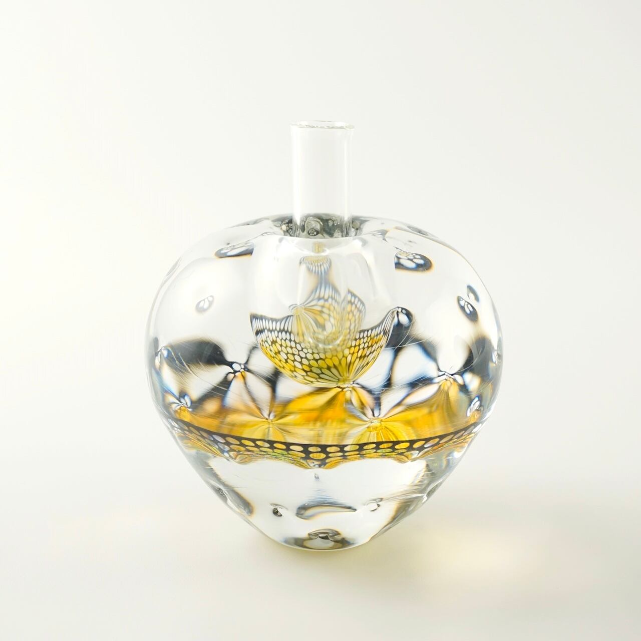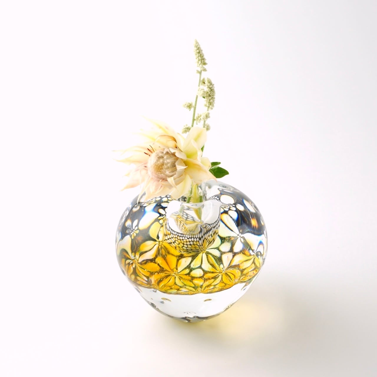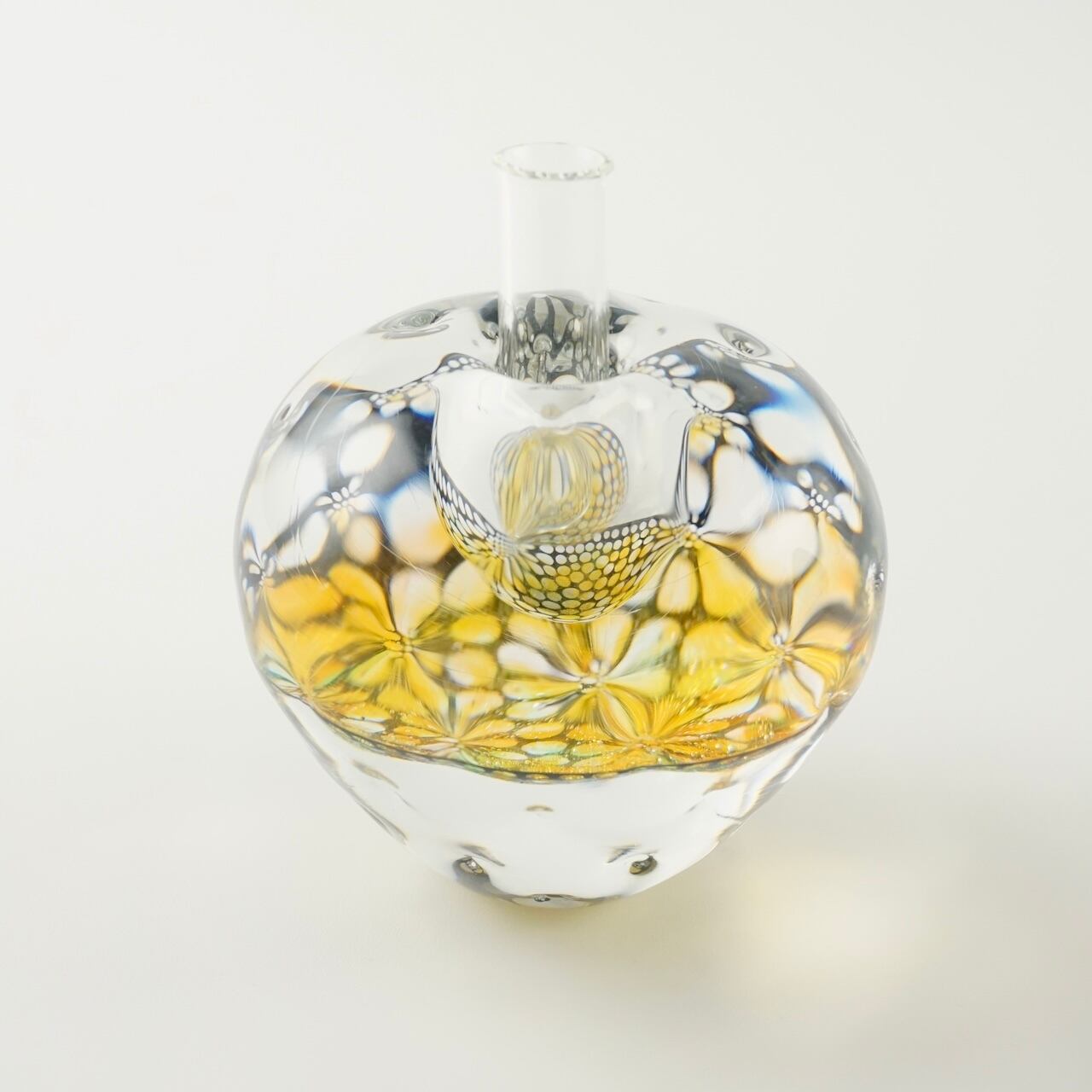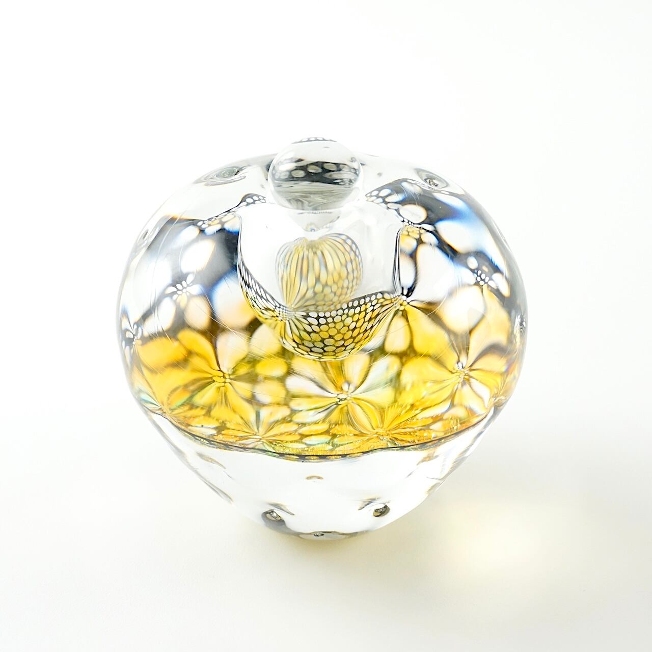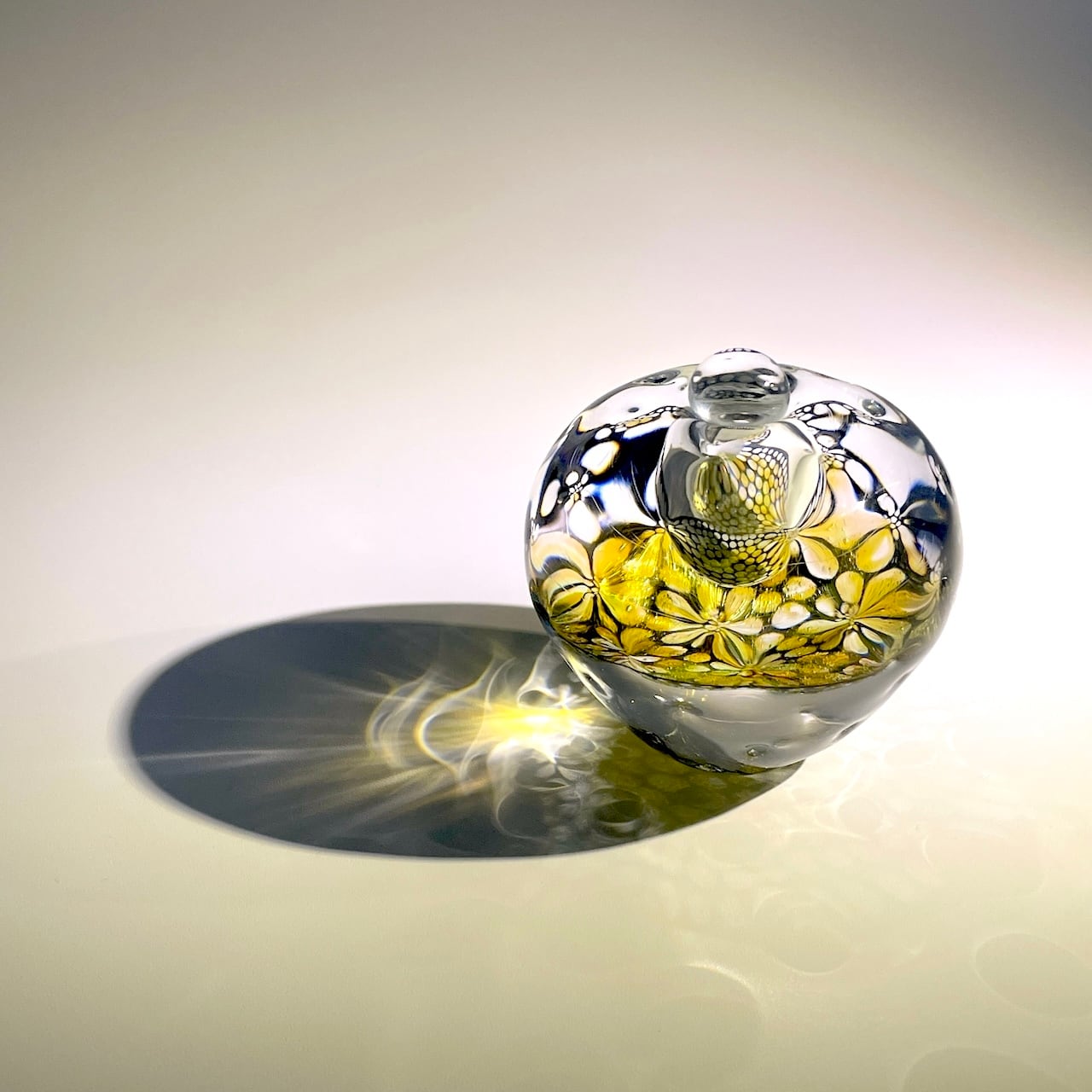 本体の中間に挟み込まれた何色もの色ガラスとエナメルで描いた模様の層が、ガラスの厚みと表面の凹みを通して万華鏡のように揺らめきます。色の組み合わせは一点一点異なり、光の当たり方によっても様々な表情をお楽しみいただけます。