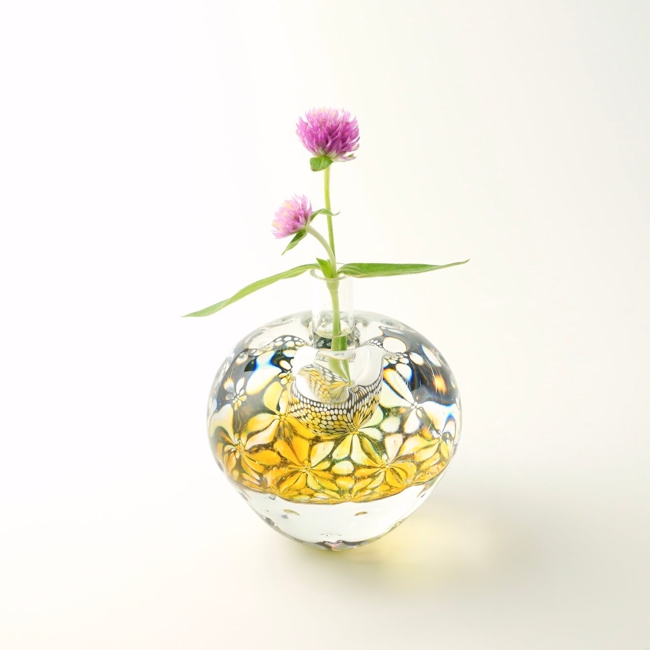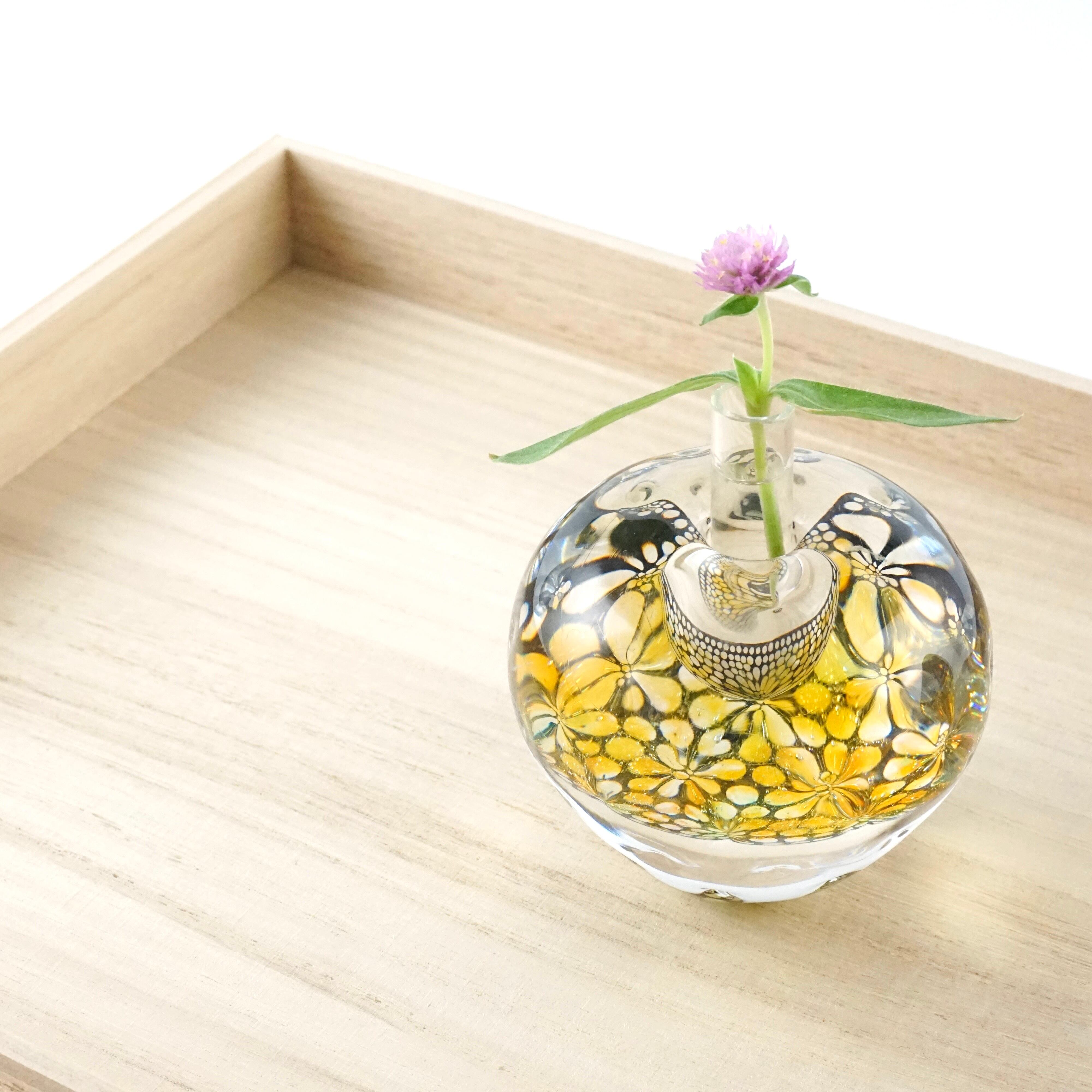 本体上部の空洞に直接または付属のガラス管に水を入れて、小さな一輪挿しとしてお使いいただけます。また、一輪挿しとして使用しないとき用の豆蓋も付属しています。