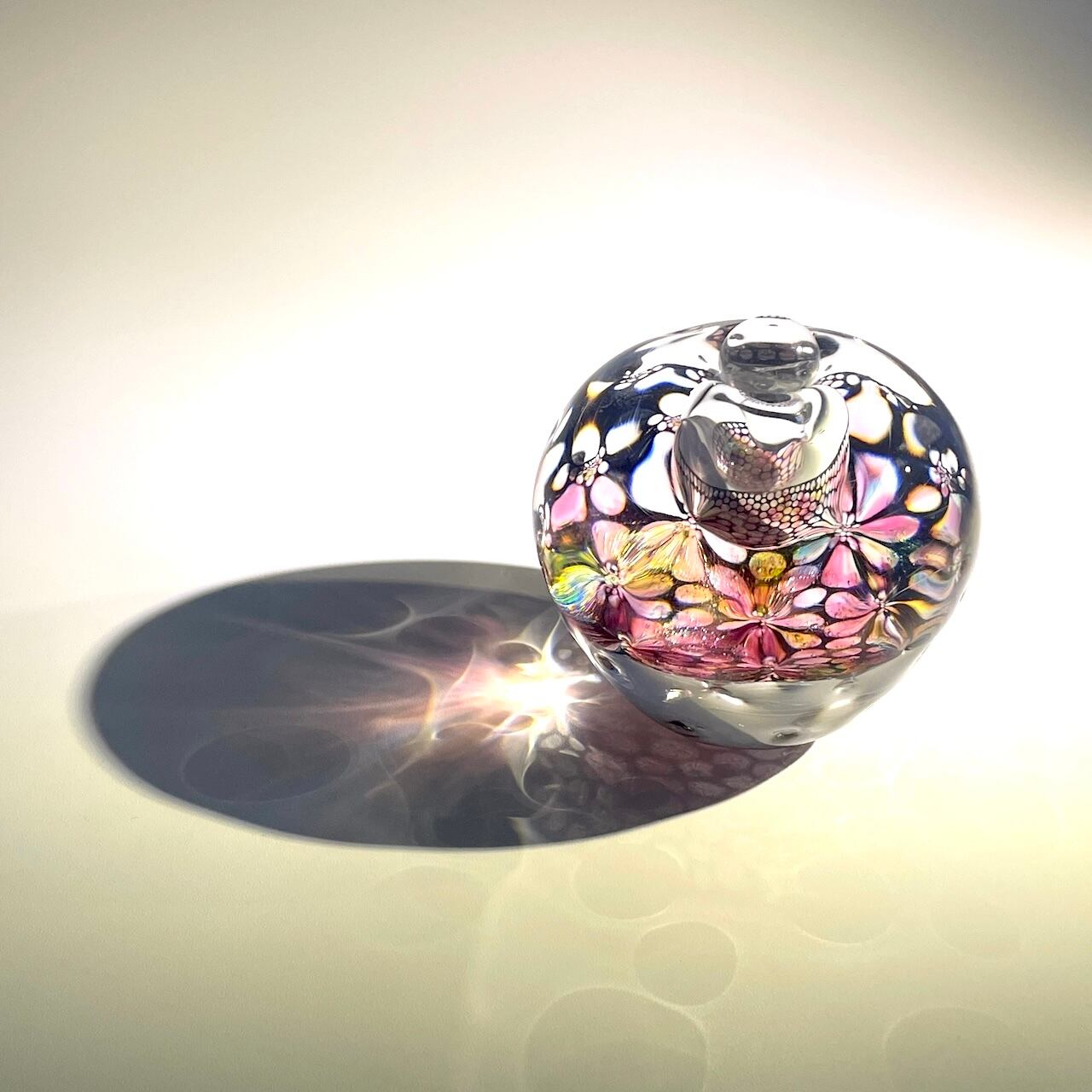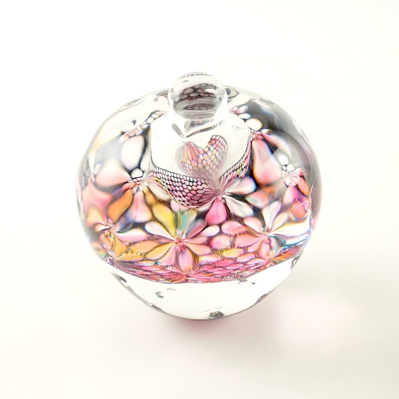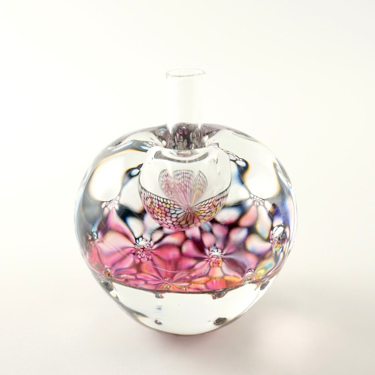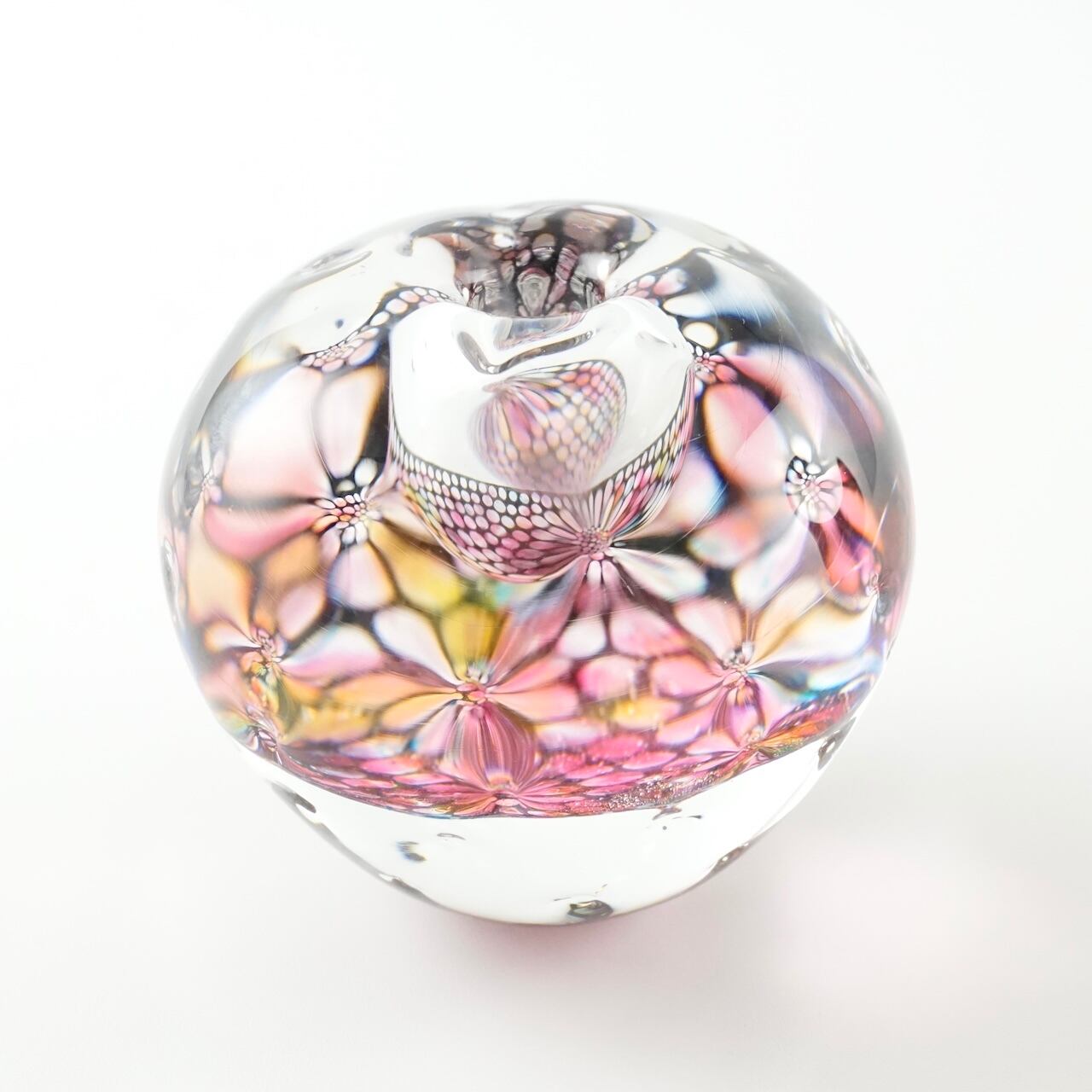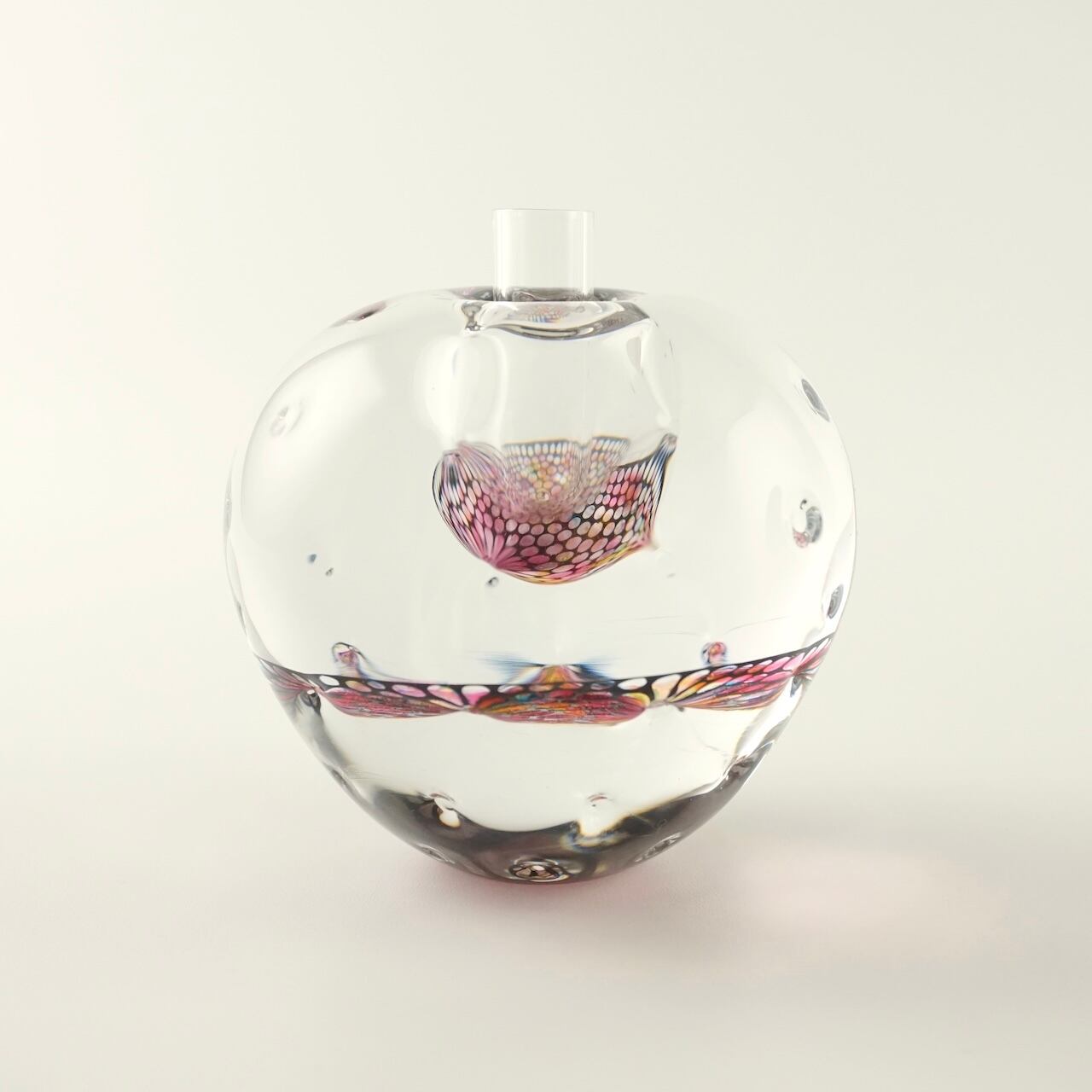 本体の中間に挟み込まれた何色もの色ガラスとエナメルで描いた模様の層が、ガラスの厚みと表面の凹みを通して万華鏡のように揺らめきます。色の組み合わせは一点一点異なり、光の当たり方によっても様々な表情をお楽しみいただけます。