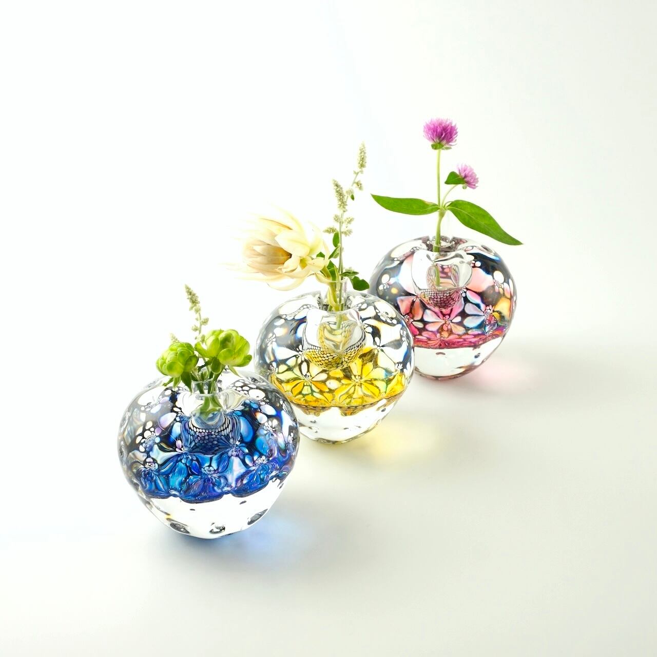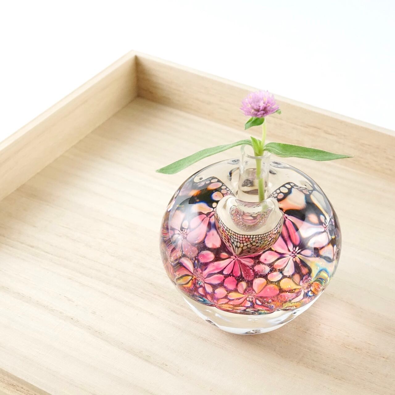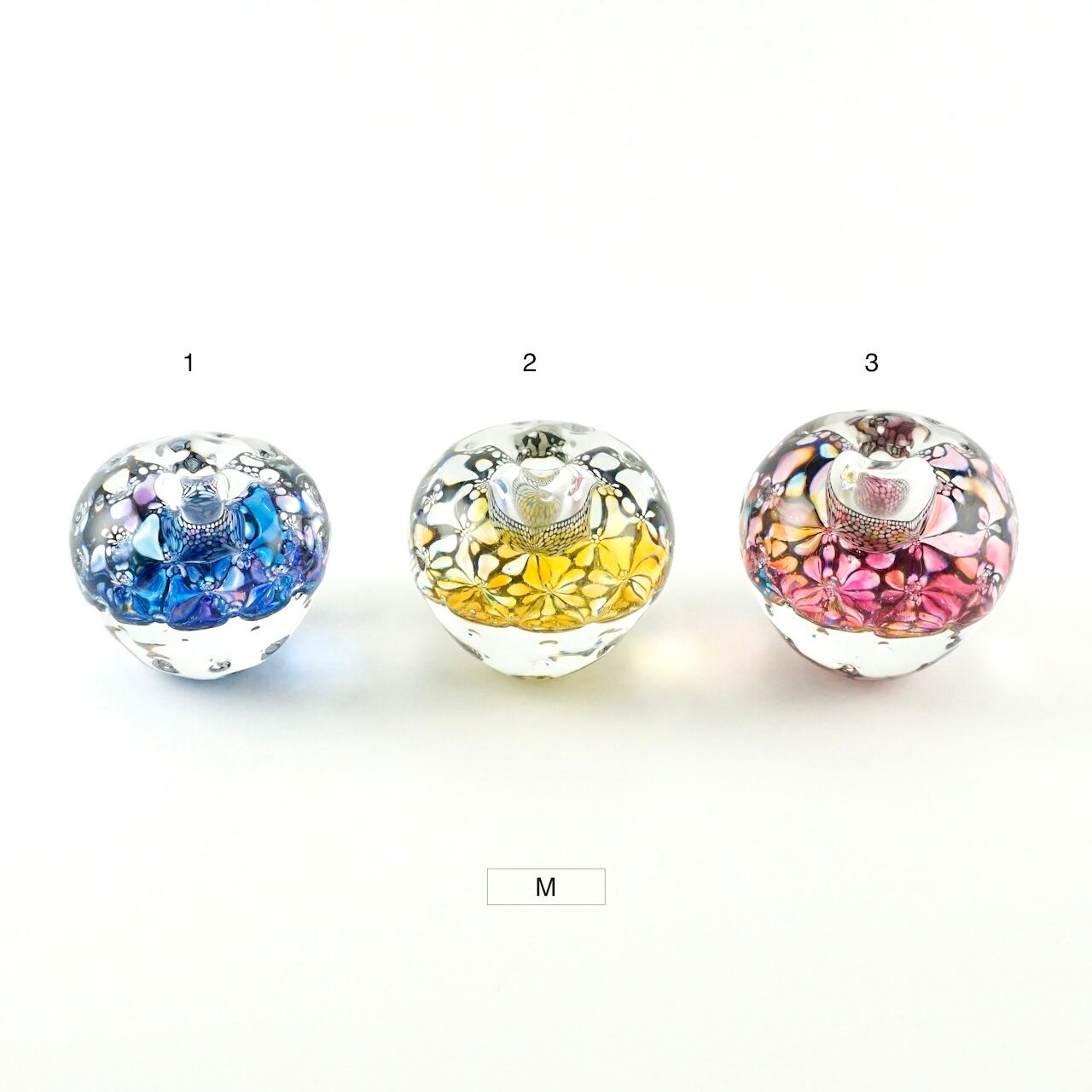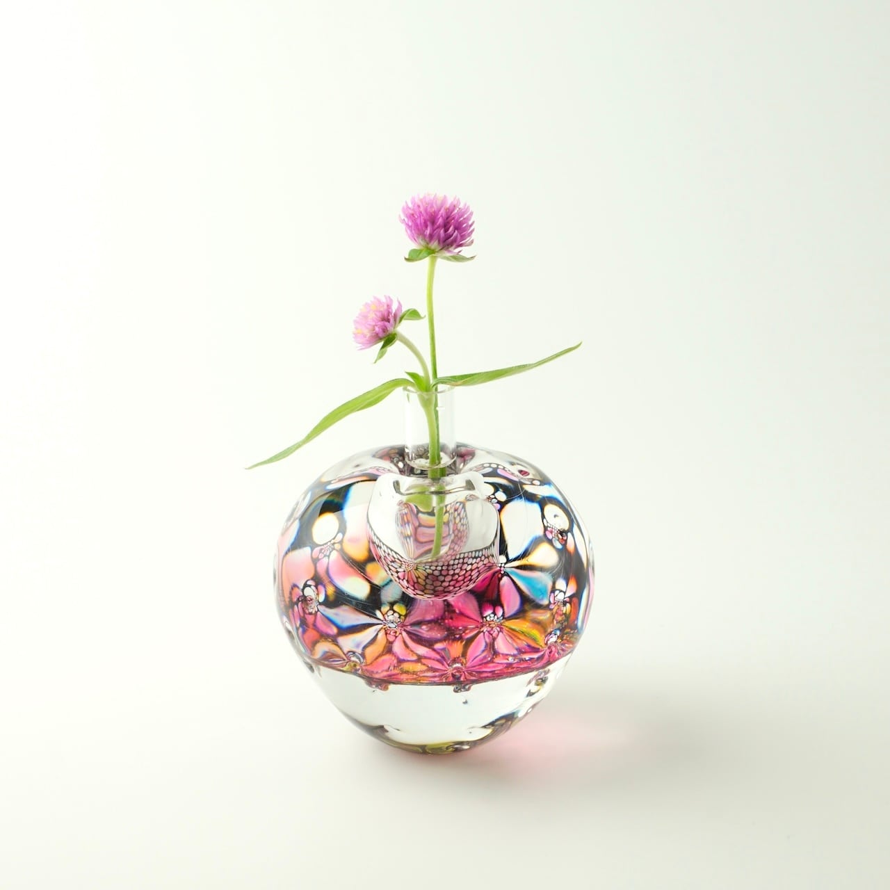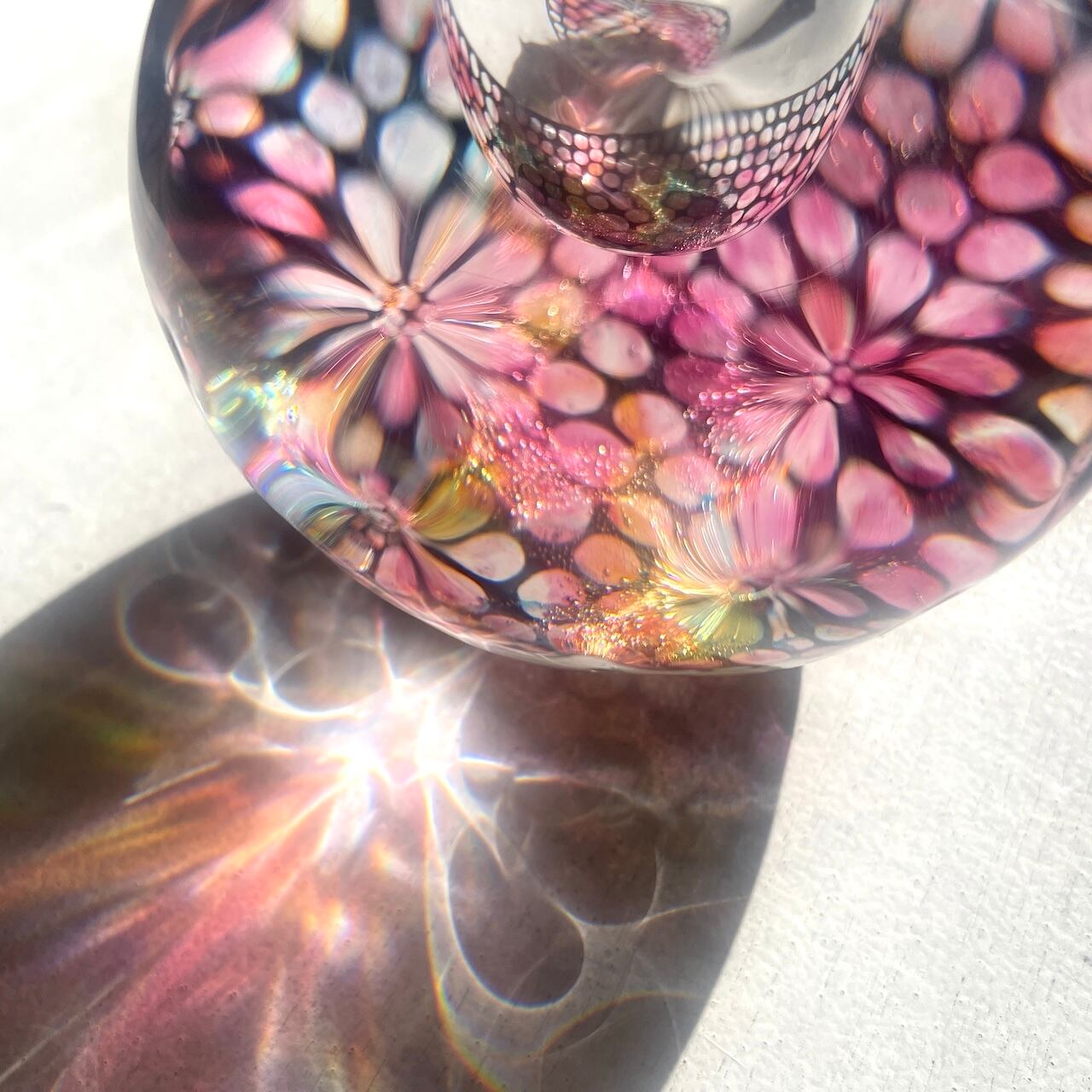本体の中間に挟み込まれた何色もの色ガラスとエナメルで描いた模様の層が、ガラスの厚みと表面の凹みを通して万華鏡のように揺らめきます。色の組み合わせは一点一点異なり、光の当たり方によっても様々な表情をお楽しみいただけます。