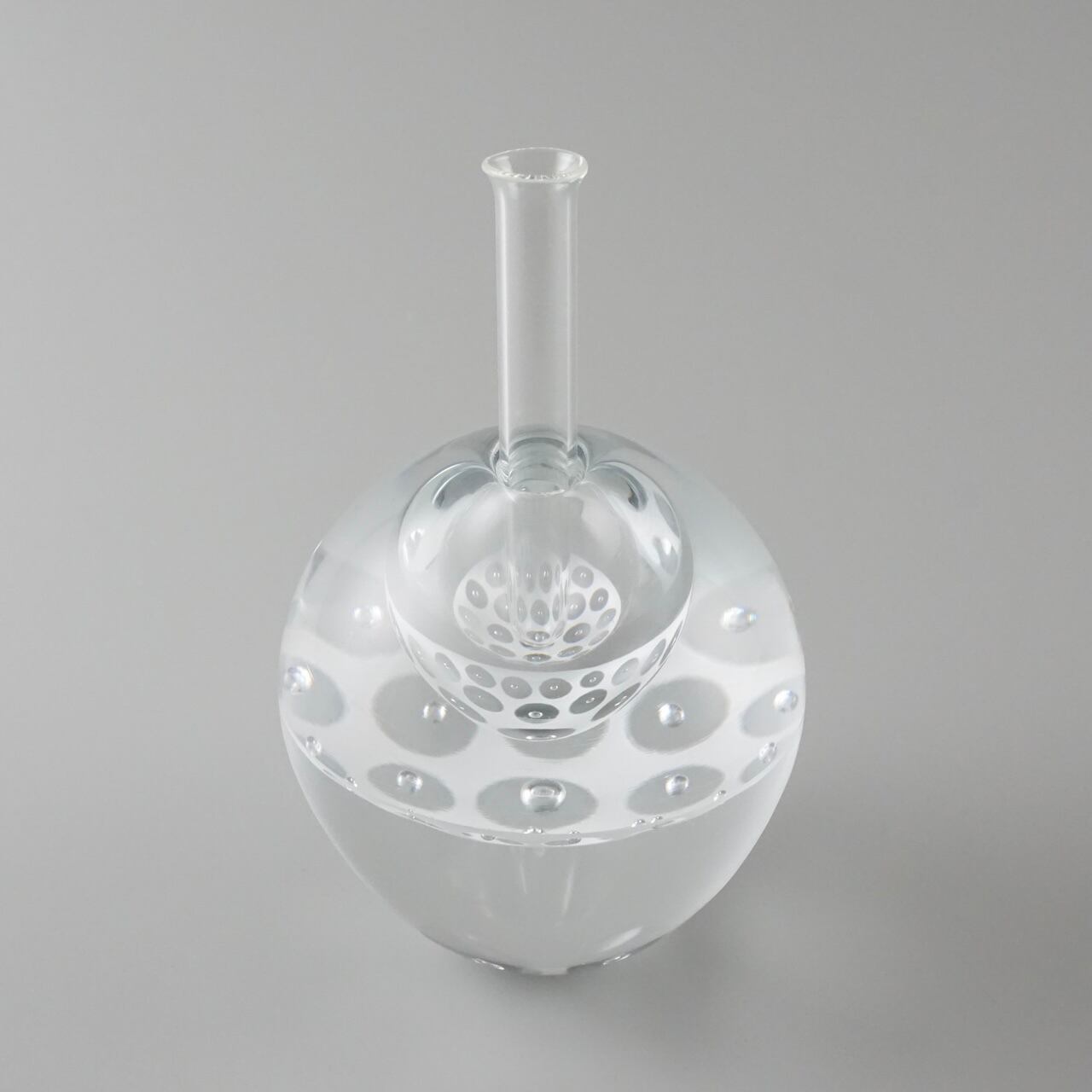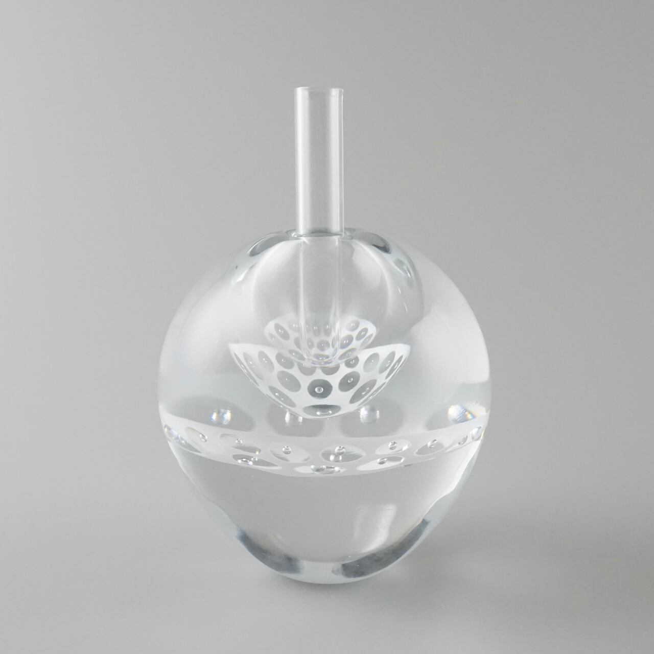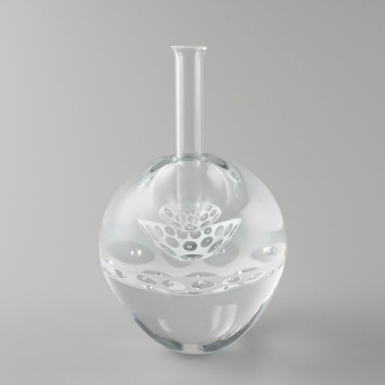 ずっしりと重みのあるガラスの内側に白のエナメル彩と気泡で作った模様の層が挟み込まれていて、シンプルながら独特の存在感を放つように制作しています。