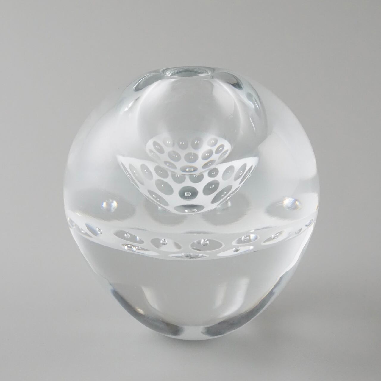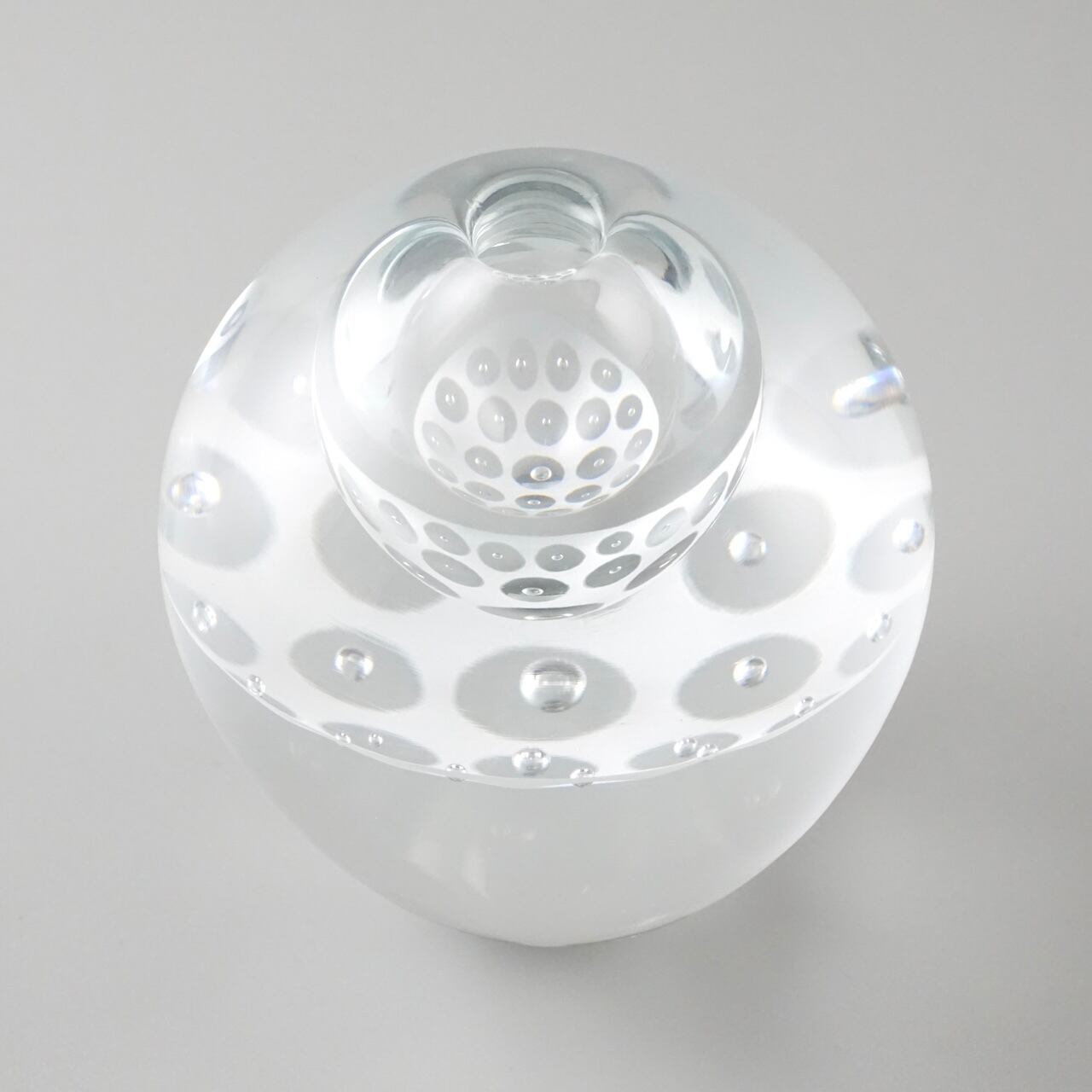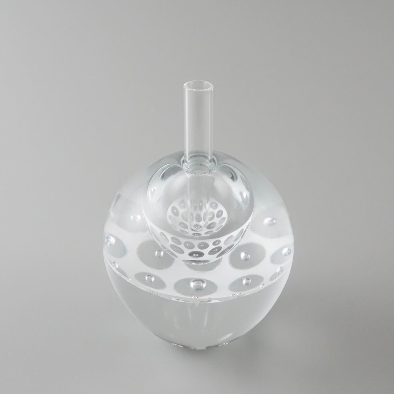 ずっしりと重みのあるガラスの内側に白のエナメル彩と気泡で作った模様の層が挟み込まれていて、シンプルながら独特の存在感を放つように制作しています。