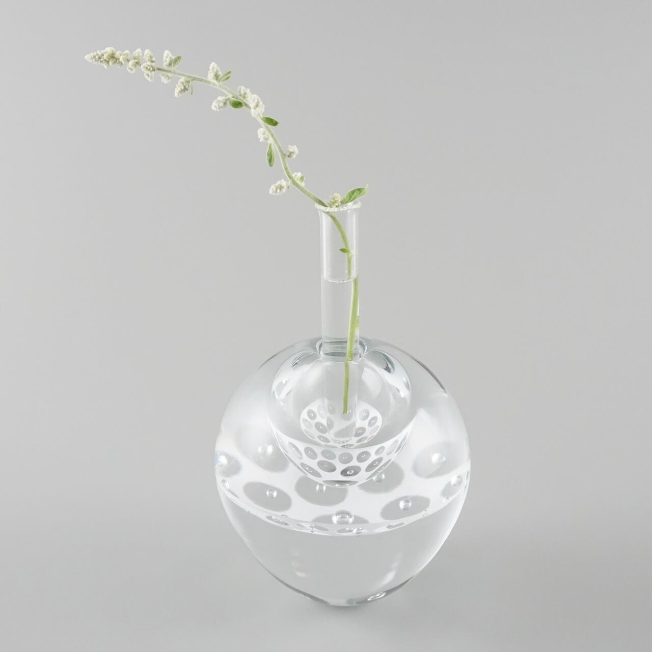 上部の空洞に水を入れたガラス管を差し込むと、一輪挿しとしてお使いいただけます。ほこり除けにもなる豆蓋も付いています。〈L-2〉は〈L-1〉より丸みがある形です。