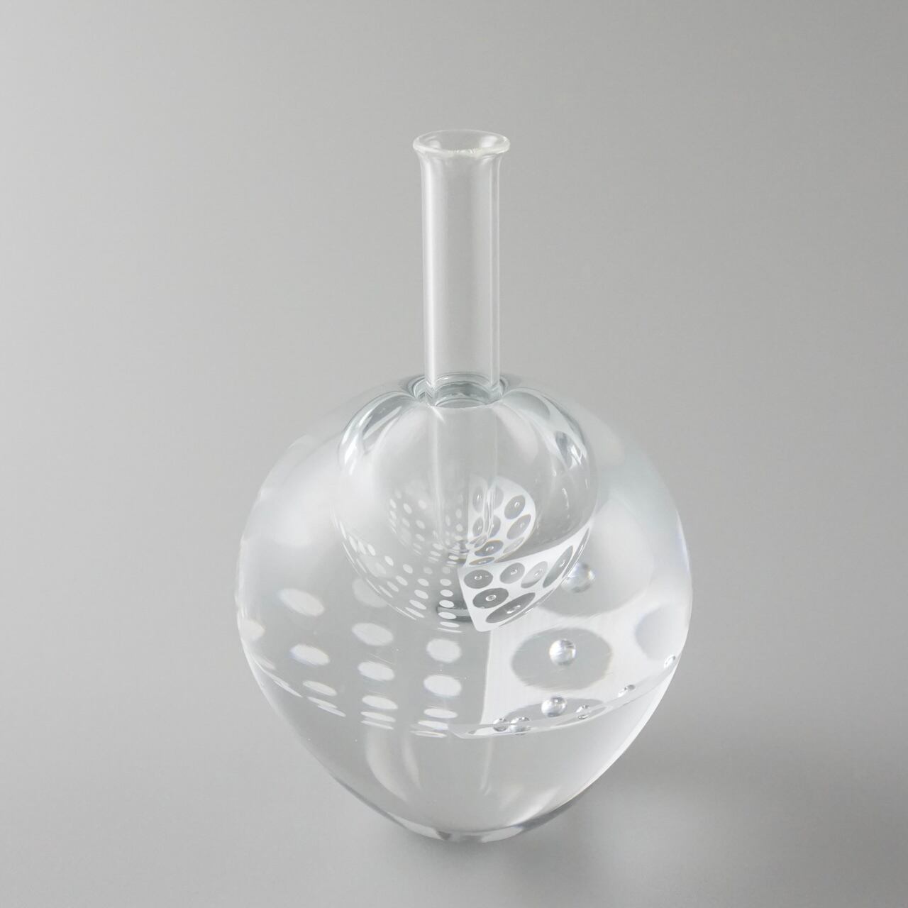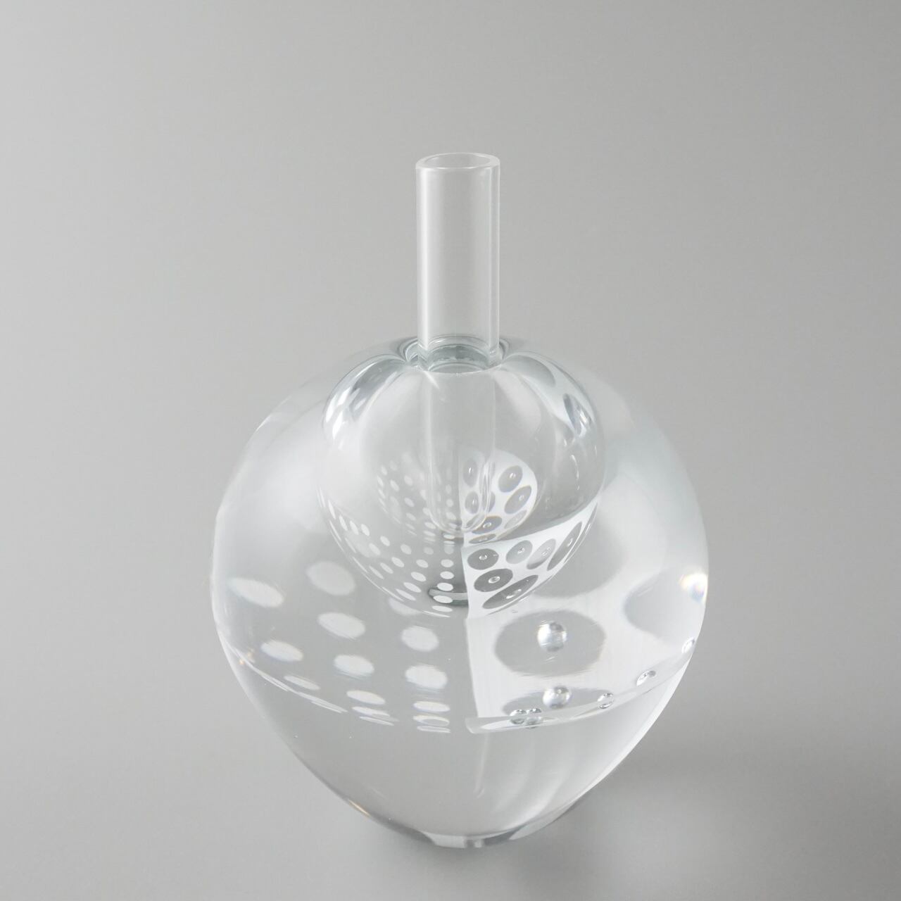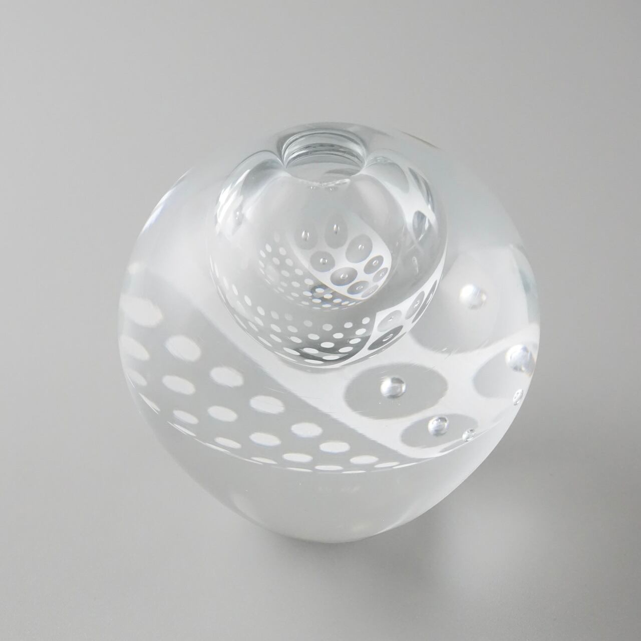 重みのあるガラスの内側に白のエナメル彩と気泡で作った模様の層が挟み込まれていて、シンプルながら独特の存在感を放つように制作しています。