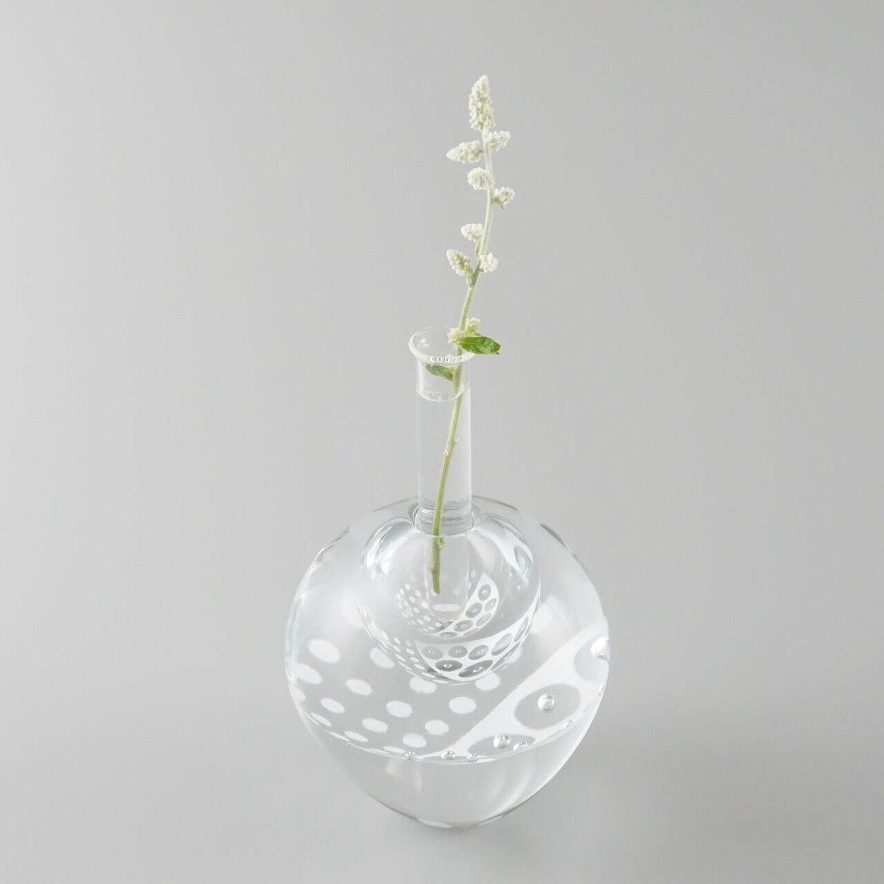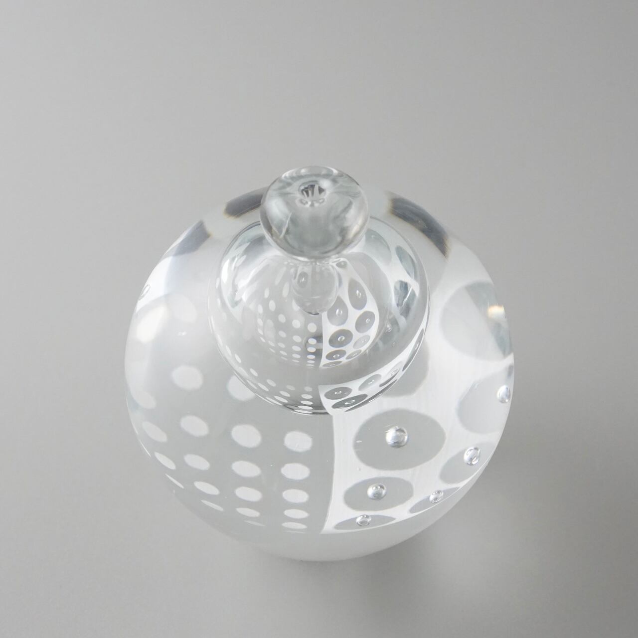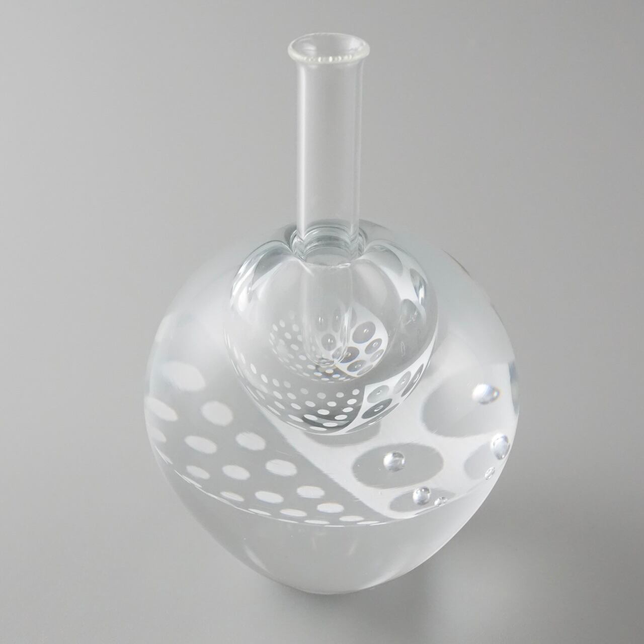 重みのあるガラスの内側に白のエナメル彩と気泡で作った模様の層が挟み込まれていて、シンプルながら独特の存在感を放つように制作しています。