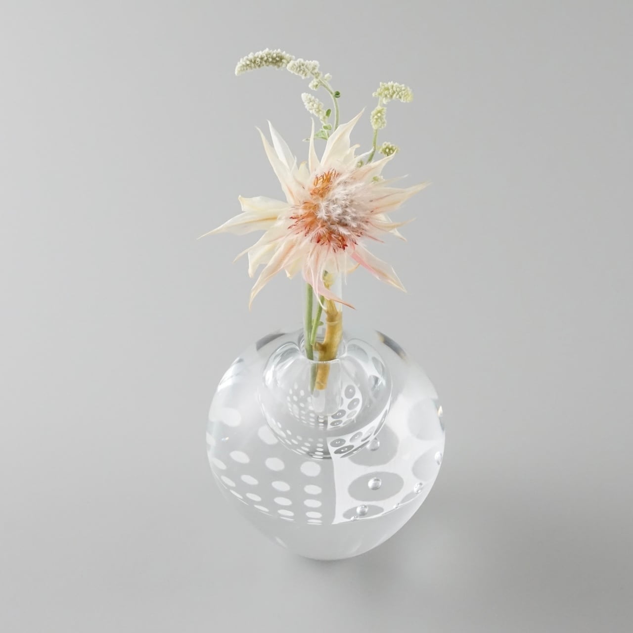 上部の空洞に水を入れたガラス管を差し込むと、一輪挿しとしてお使いいただけます。