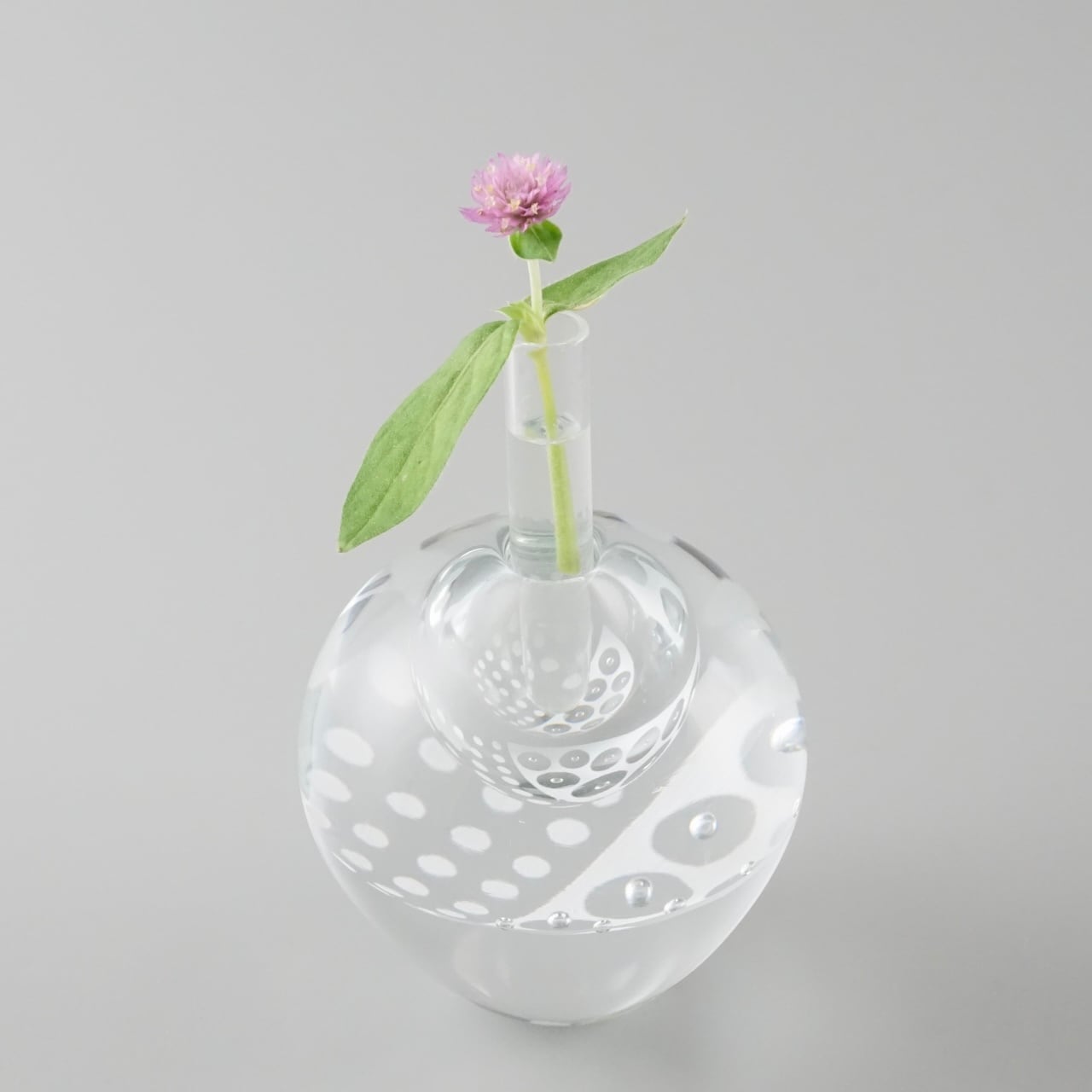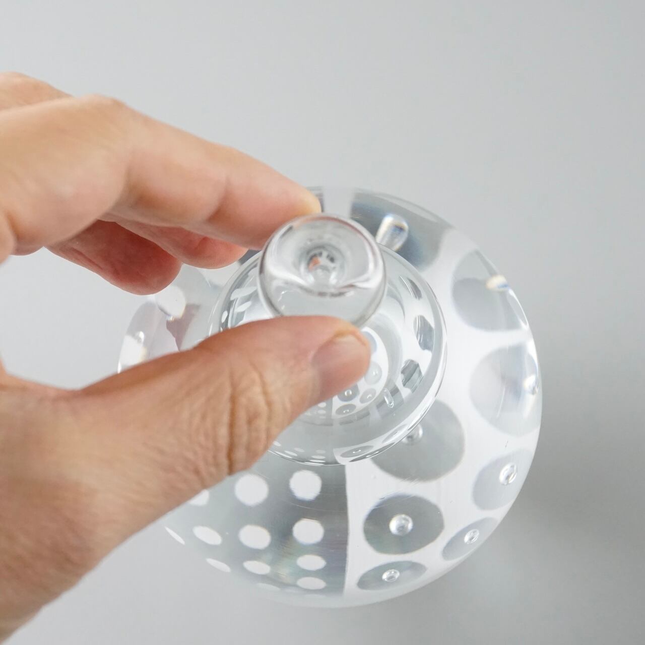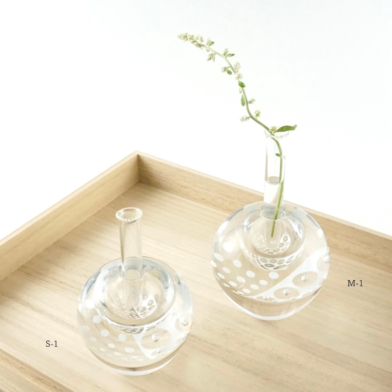 気泡の入った模様は細胞が繋がっていく様子、水玉部分は細胞の生まれるもっと「素(もと)」のイメージから。模様の層が空洞部分にも映り込み、見る角度によって景色が変化します。fractionと少し模様が異なり、よりプリミティブな印象です。