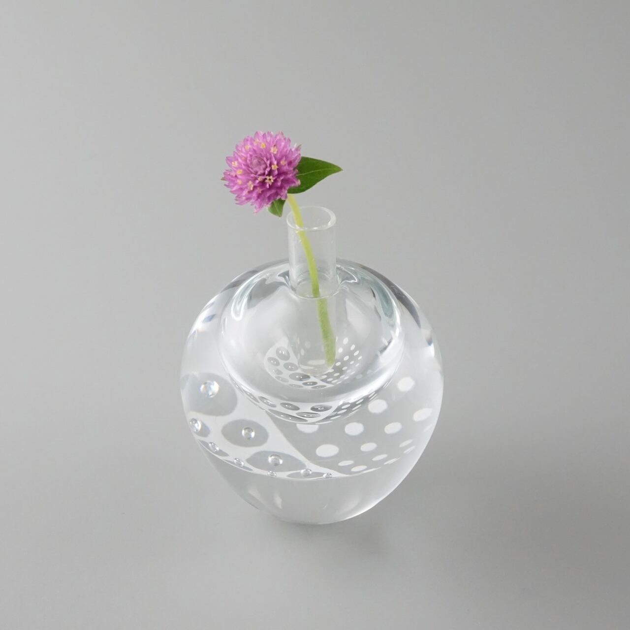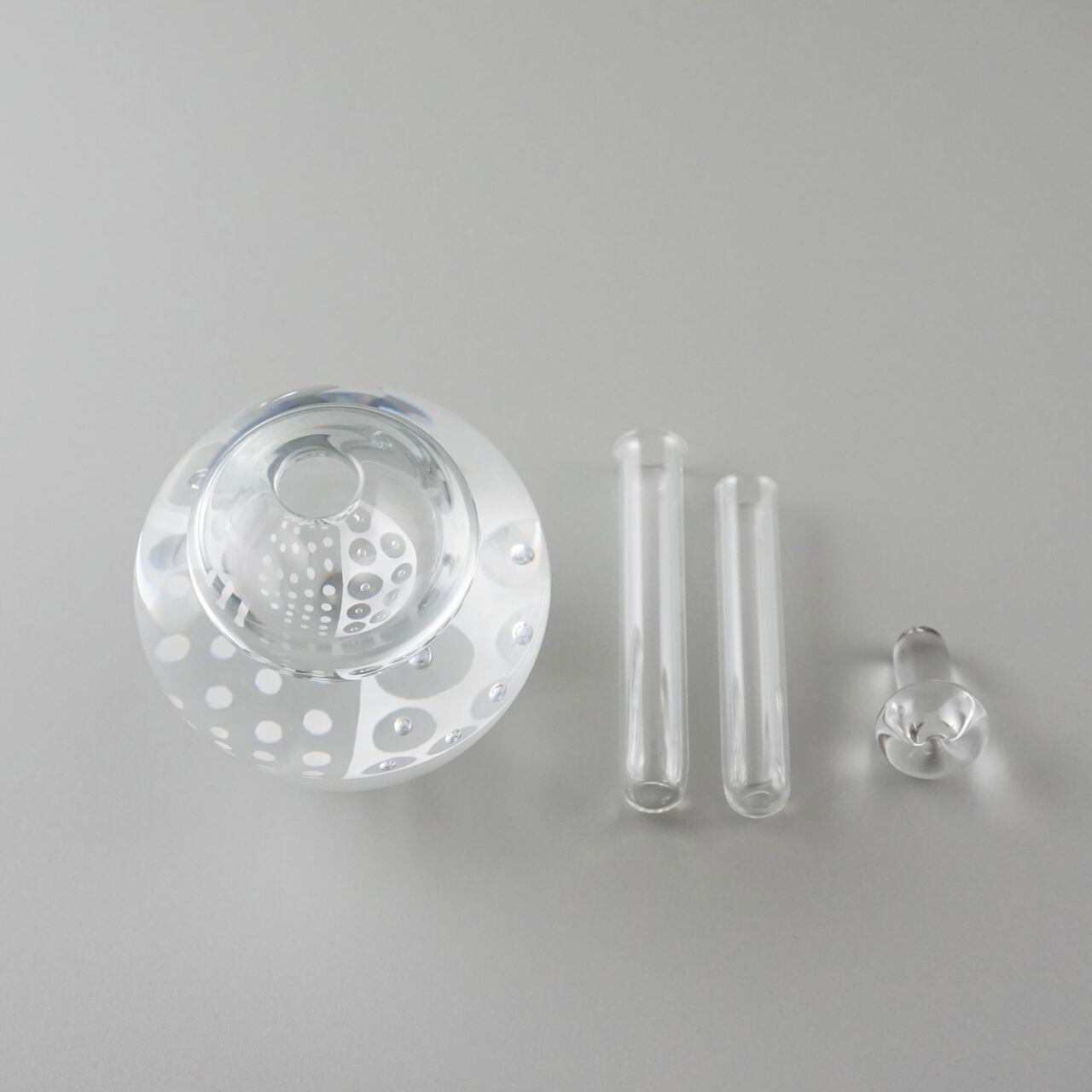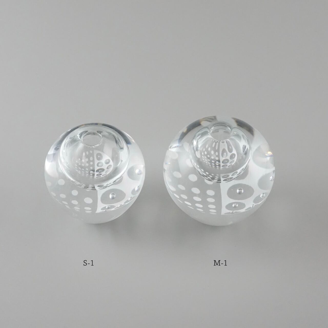 気泡の入った模様は細胞が繋がっていく様子、水玉部分は細胞の生まれるもっと「素(もと)」のイメージから。模様の層が空洞部分にも映り込み、見る角度によって景色が変化します。fractionと少し模様が異なり、よりプリミティブな印象です。