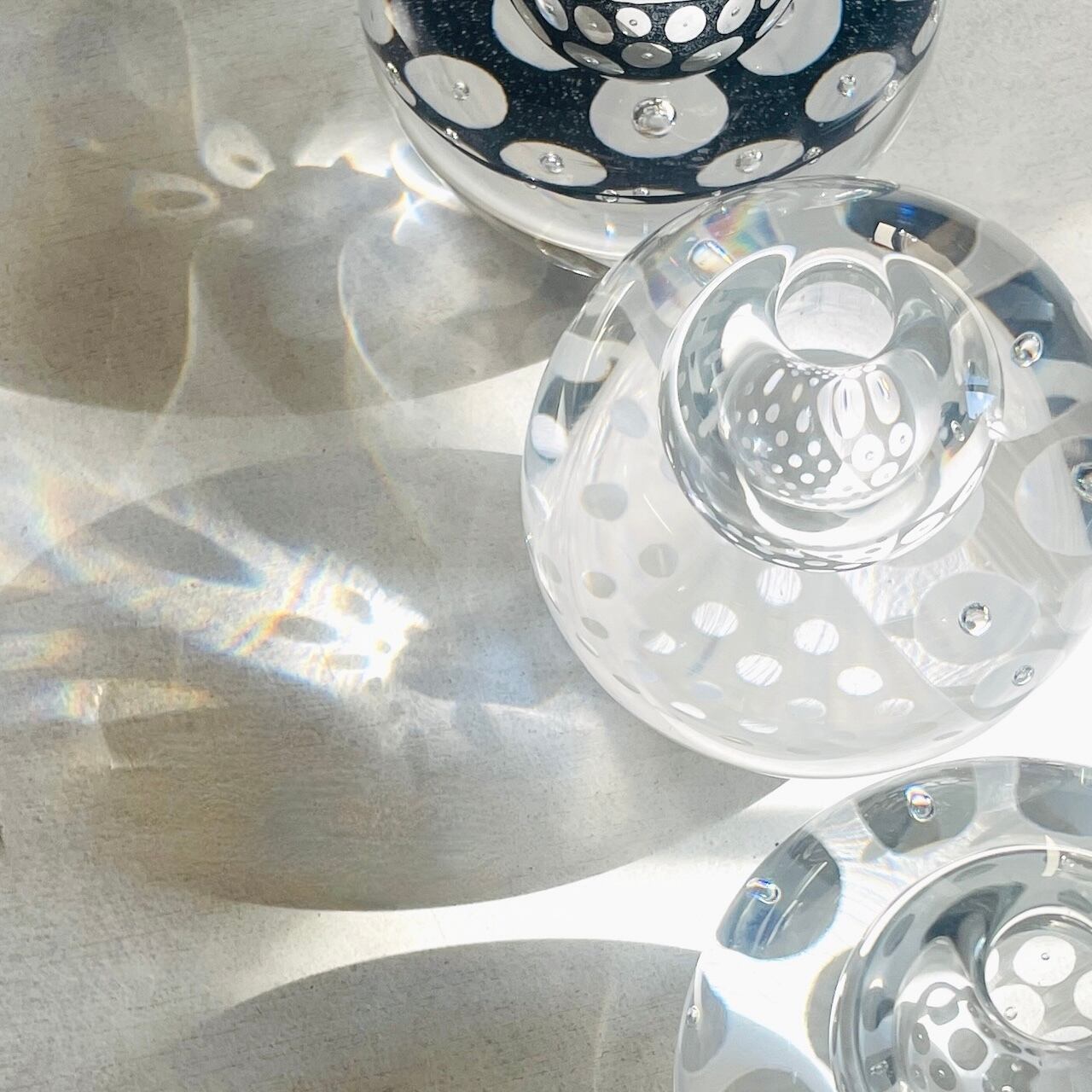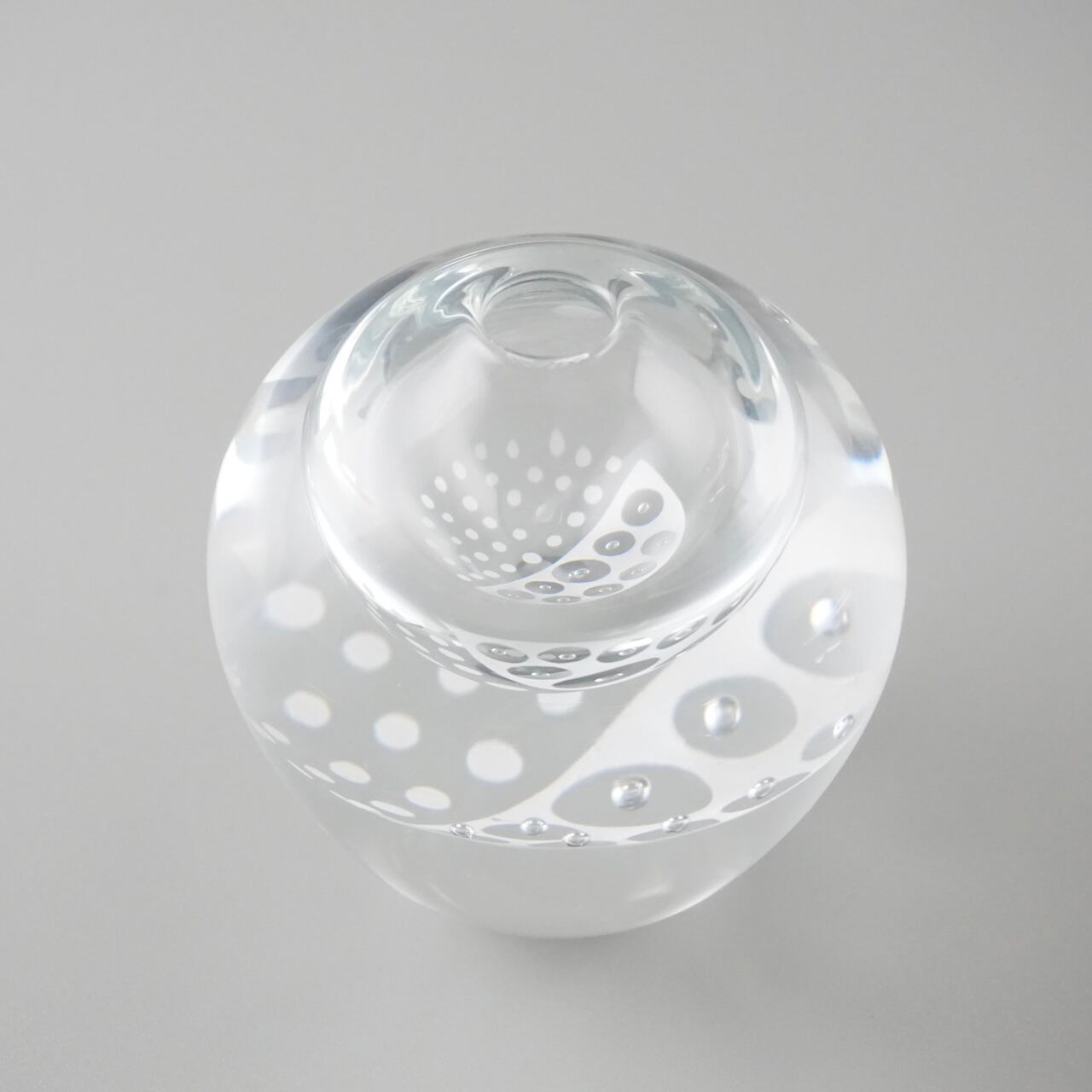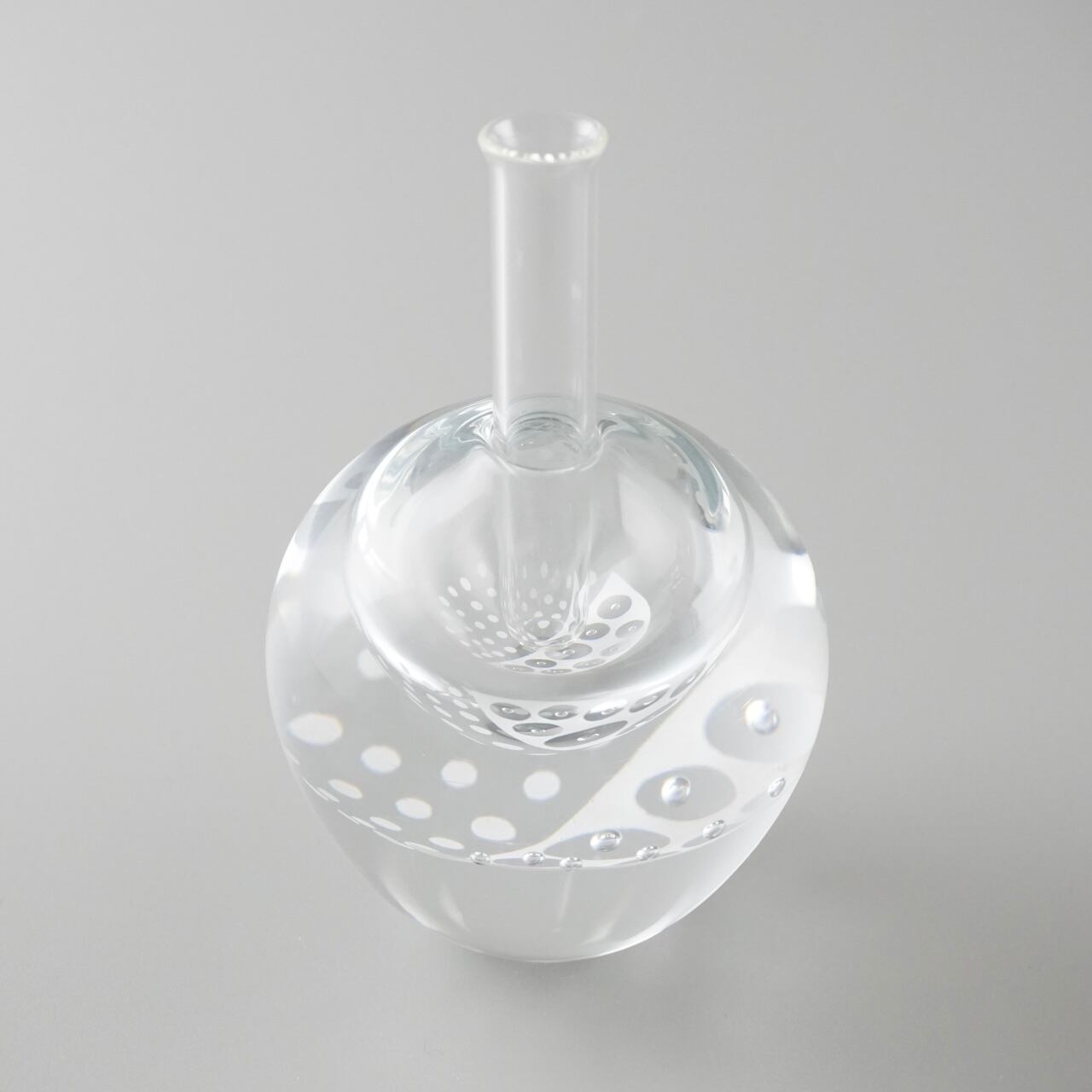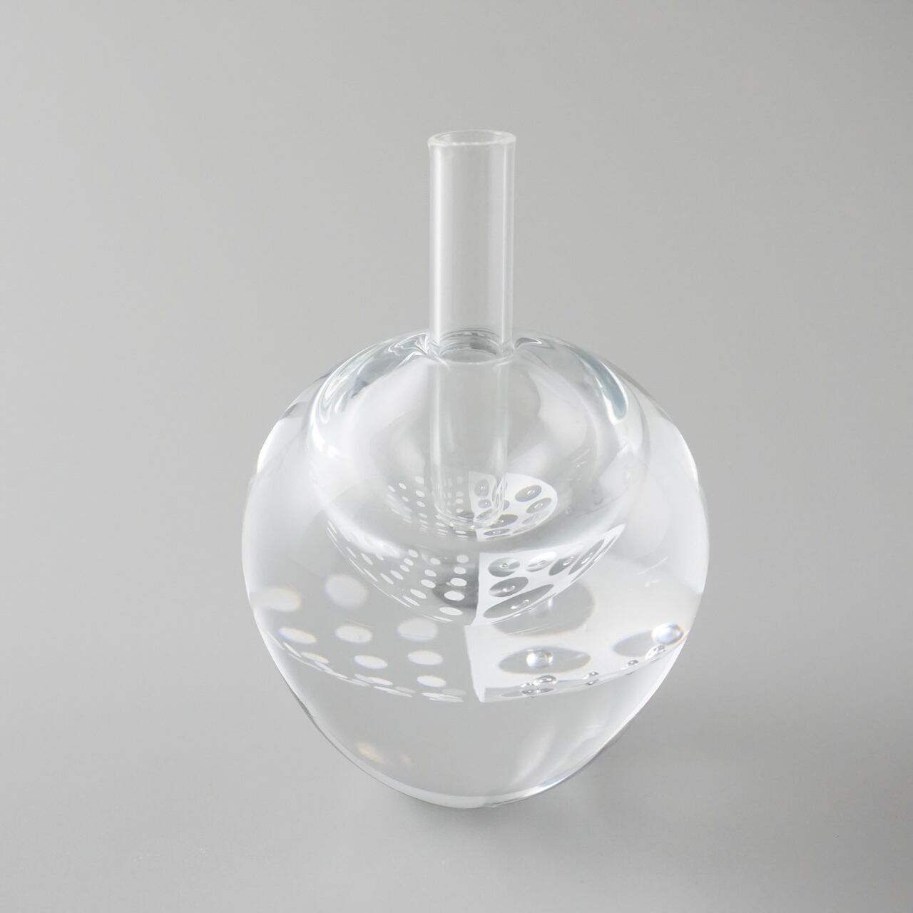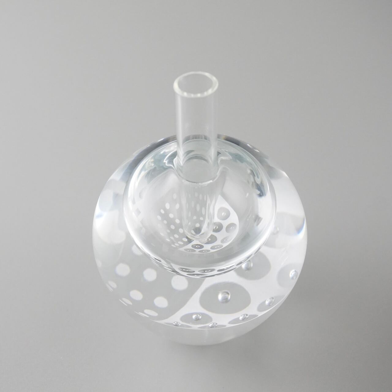 重みのあるガラスの内側に白のエナメル彩と気泡で作った模様の層が挟み込まれていて、シンプルながら独特の存在感を放つように制作しています。